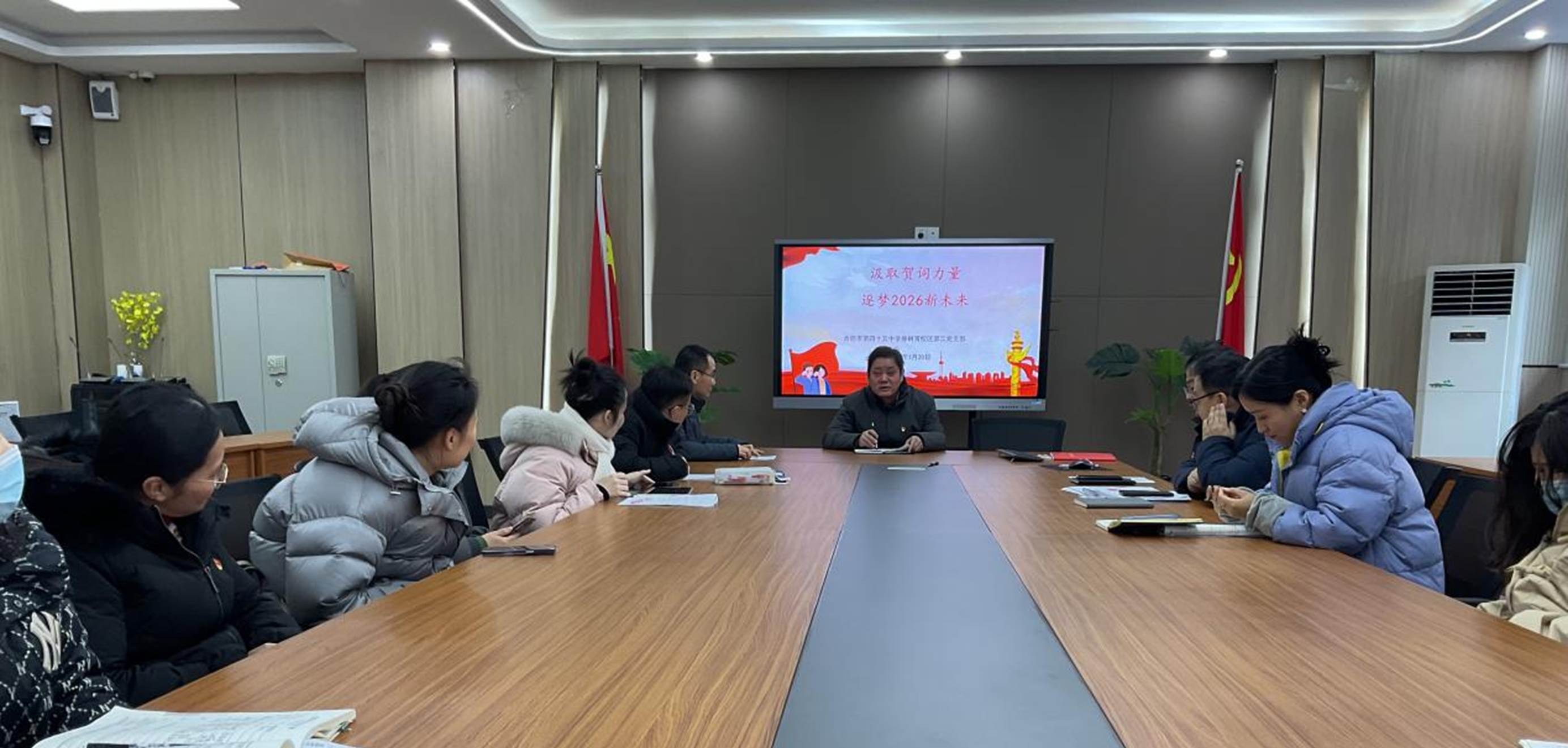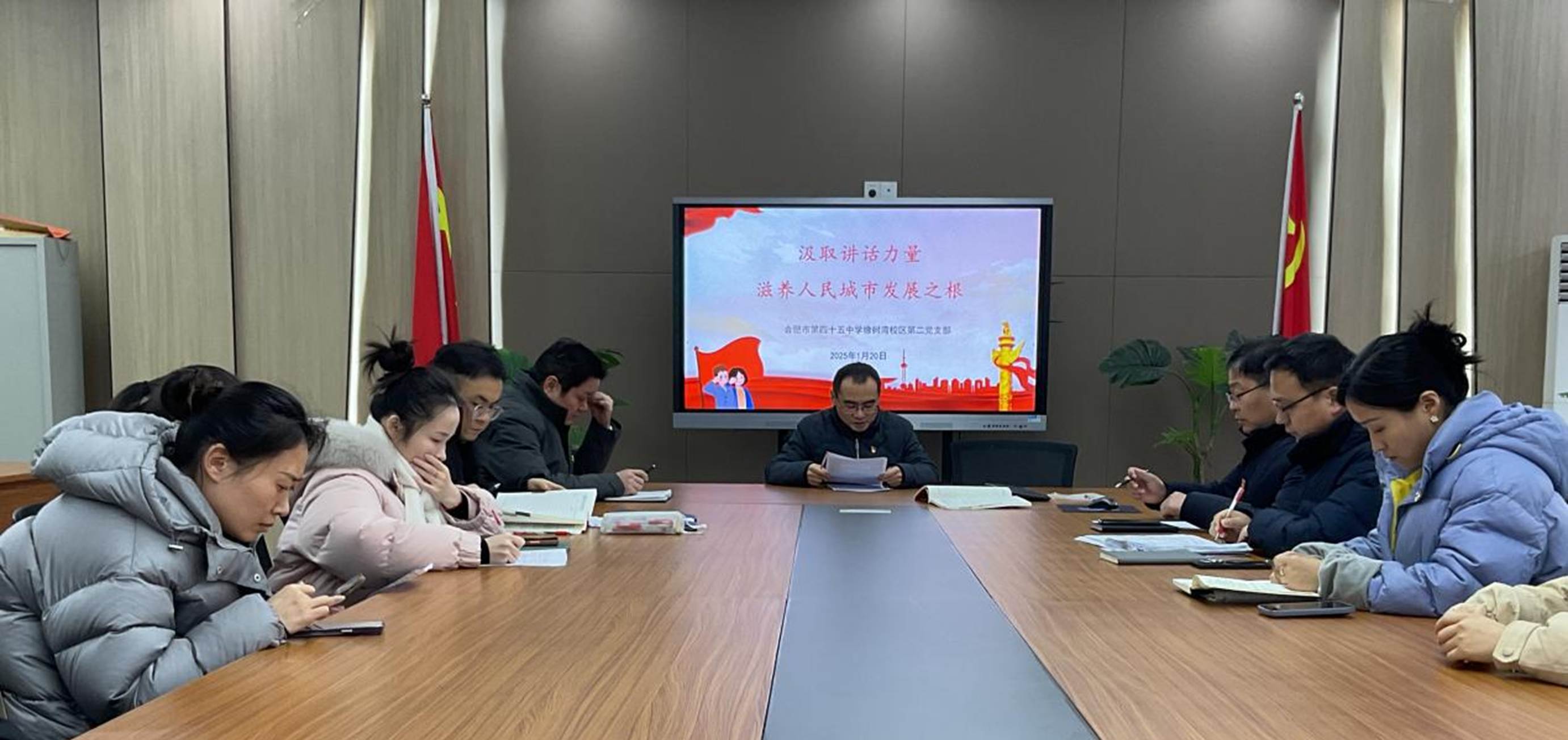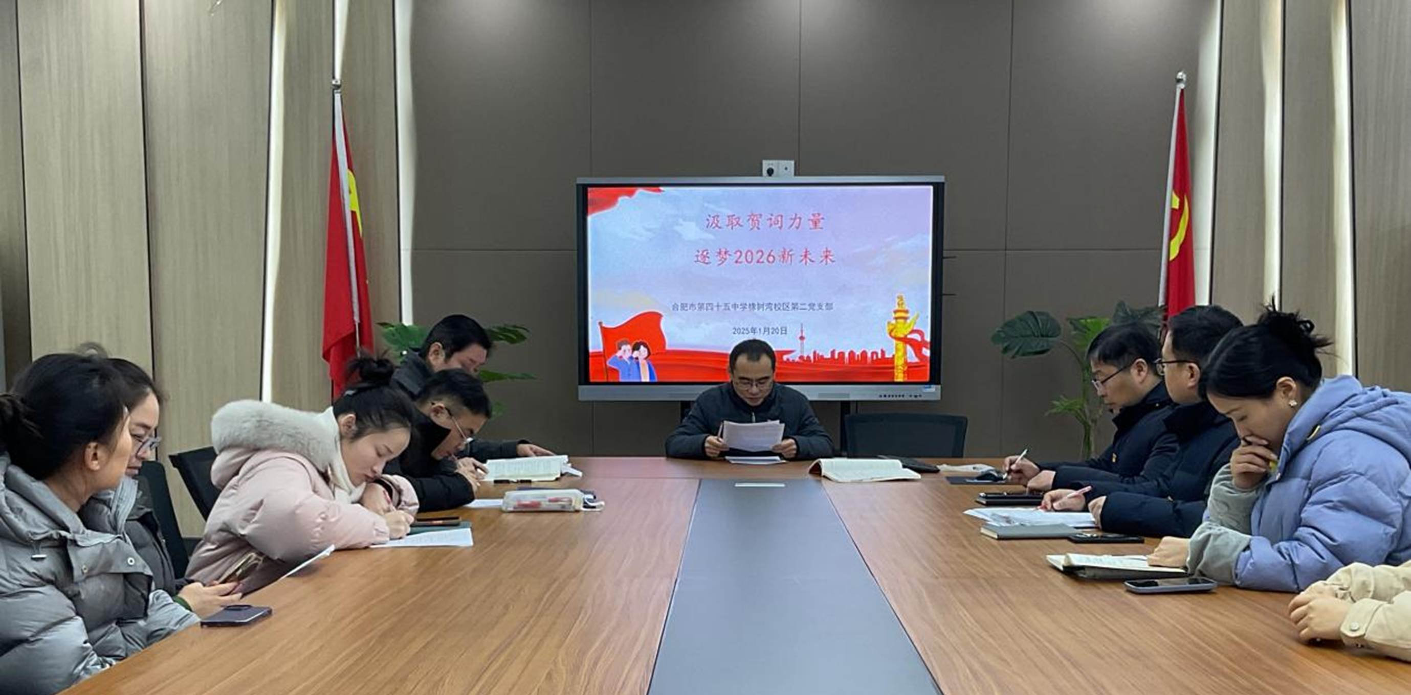 2026年1月20日15:00,合肥市第四十五中学橡树湾校区第二党支部在校接待室举行全体党员集中学习。支部书记何钧领学习近平主席二〇二六年新年贺词、二十届中央纪委五次全会重要讲话精神、中共中央政治局民主生活会精神及省、市、区委最新部署,引导党员教师把思想和行动统一到党中央决策部署上来。