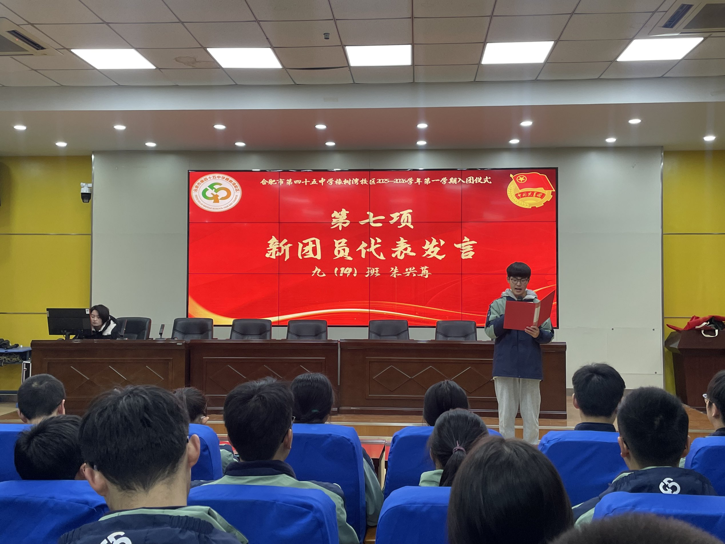 宣誓结束后,新团员代表九(14)班朱兴苒同学上台发言。他首先分享了自己加入共青团的激动心情,随后结合自身学习生活,表达了将以团员身份为新起点,勤奋学习、积极进取,自觉践行团员义务、传承红色基因的决心。他的发言真挚恳切,引发了在场同学们的强烈共鸣,也让大家对 “青春跟党走” 有了更深刻的理解。
