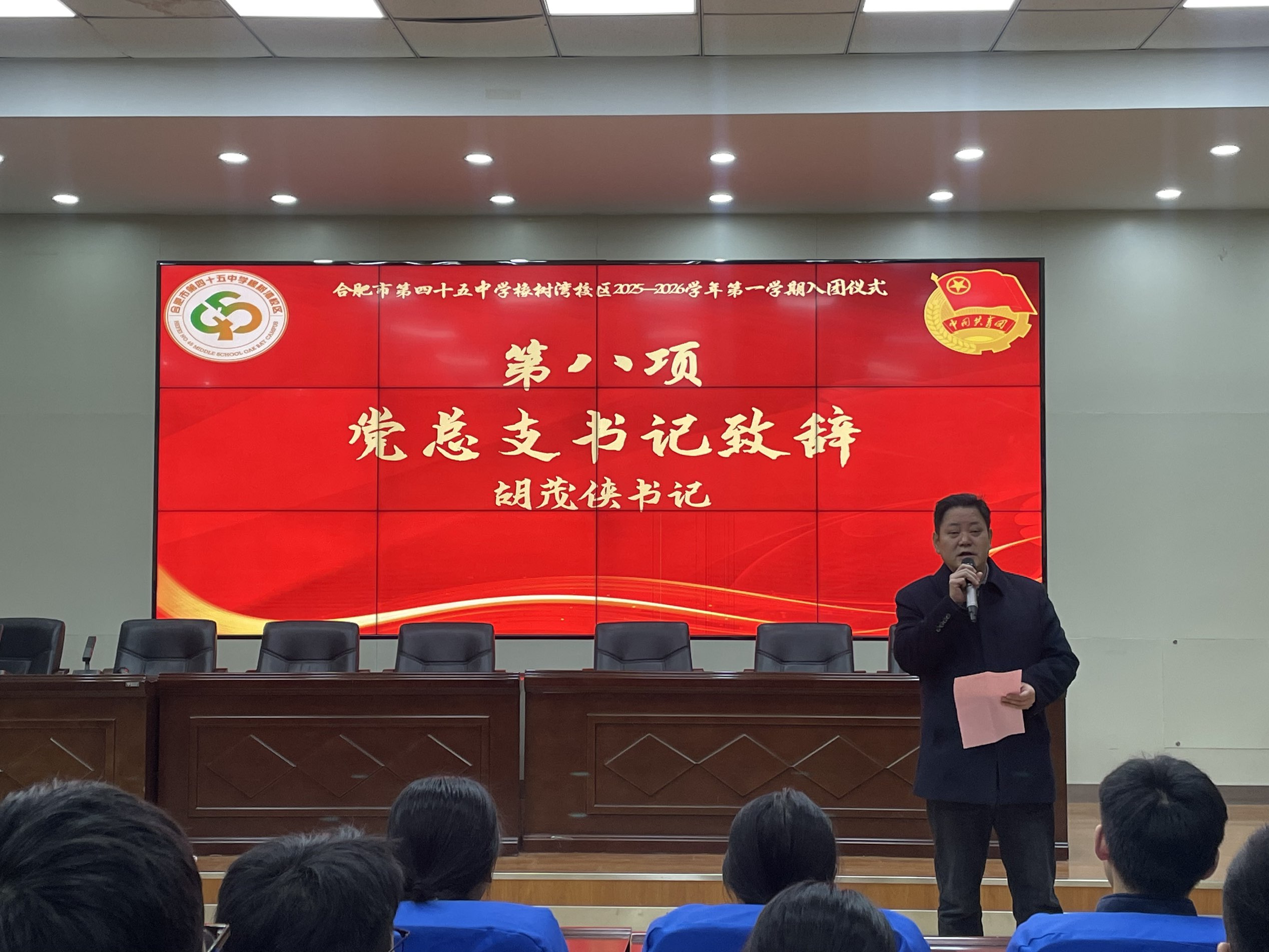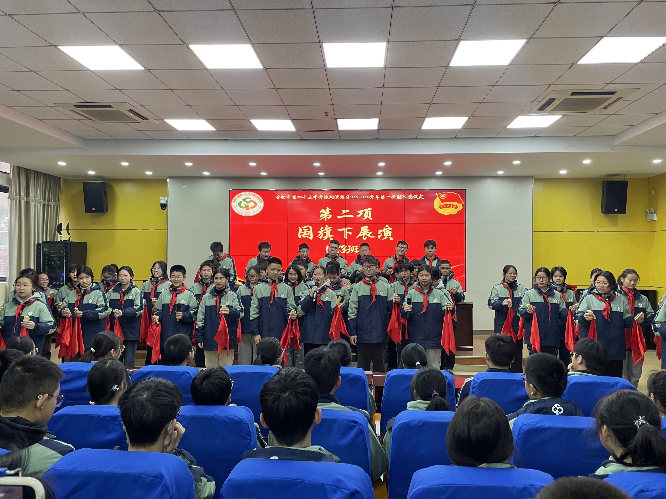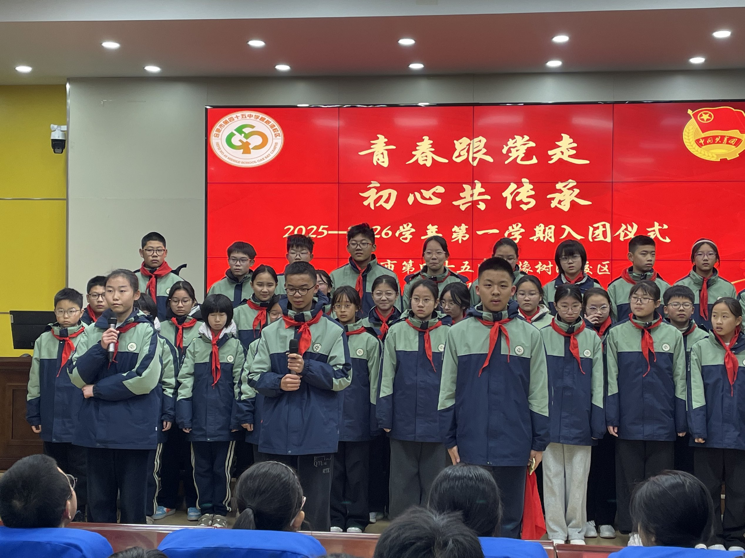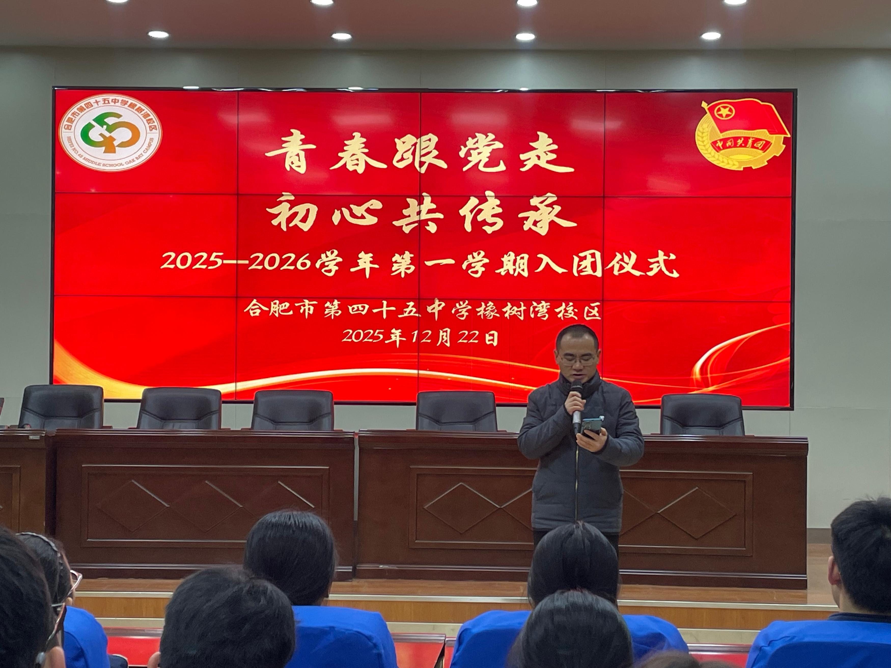 晨光洒满校园,信仰点亮青春。20251222日,合肥市第四十五中学橡树湾校区全体师生怀着崇敬与期待,隆重举行青春跟党走,初心共传承主题升旗仪式暨 2025—2026 学年第一学期入团仪式。本次升旗仪式由八(13)班全体同学承担,八(1)班郑晗灵与八(6)班李恩泽两位同学担任主持人。本次活动,师生们以青春之名致敬祖国,以赤诚之心传承初心。