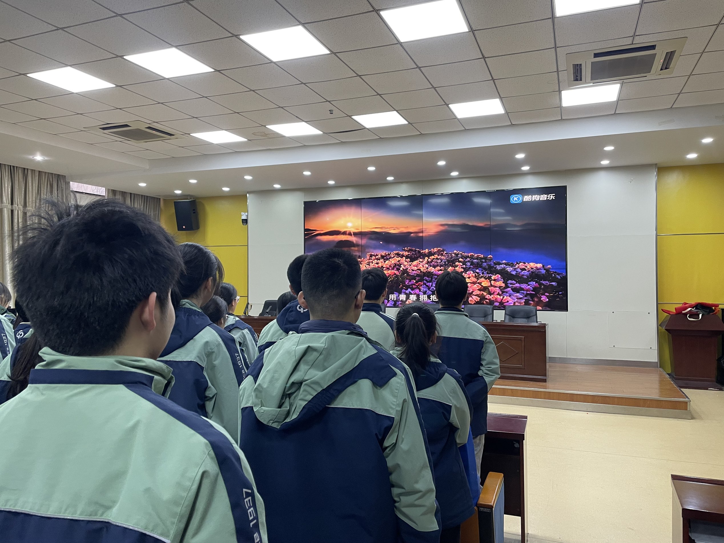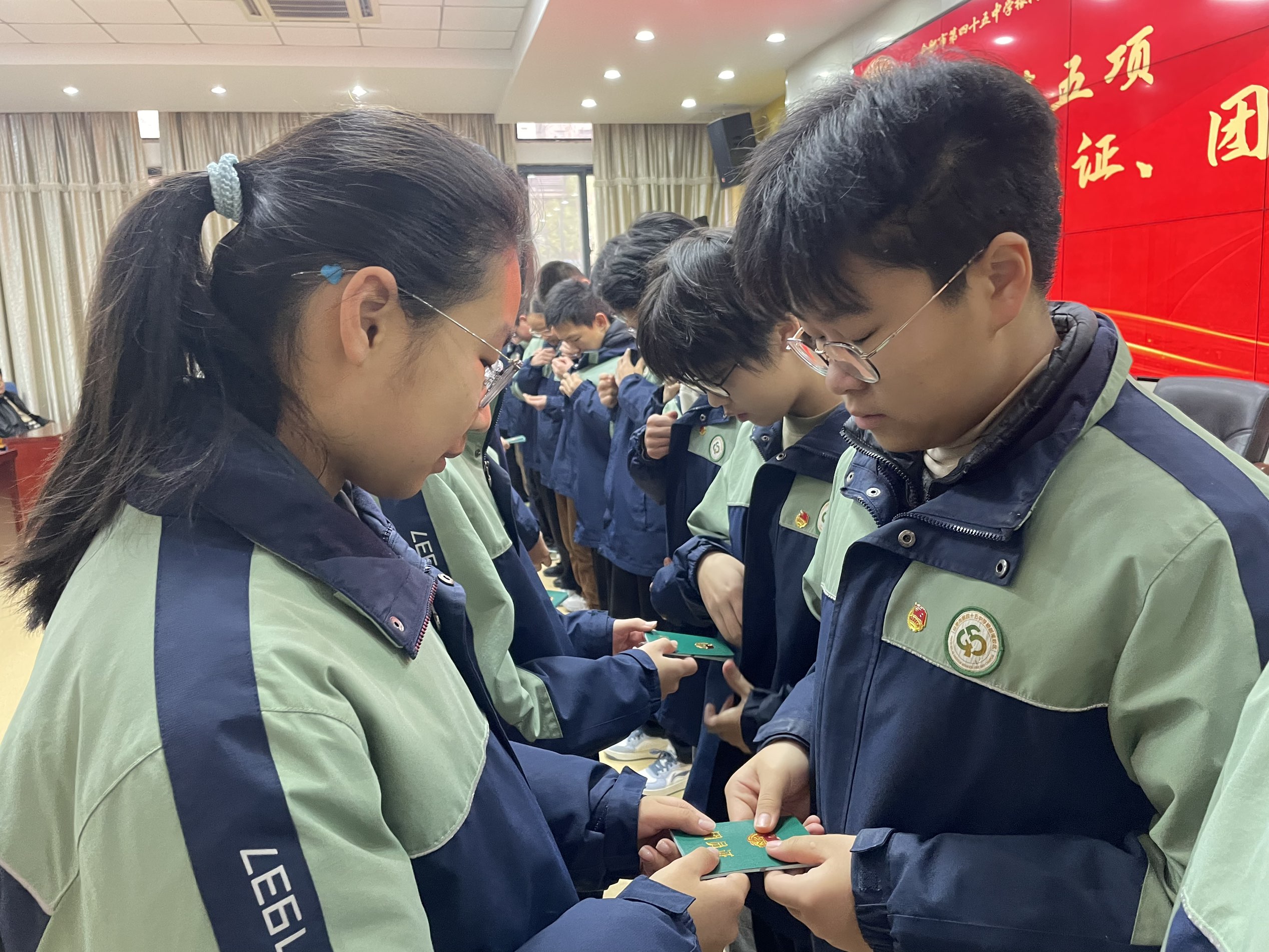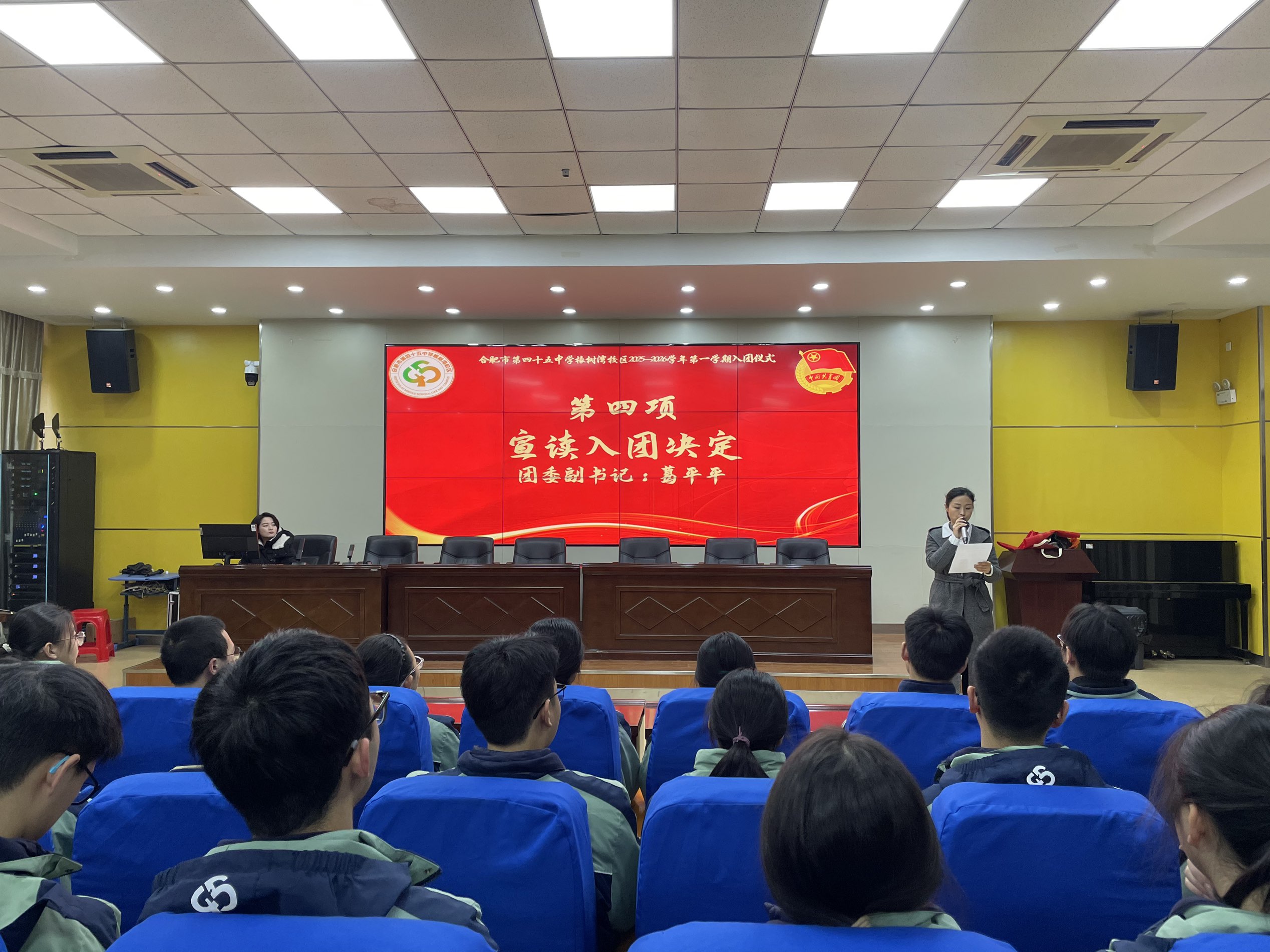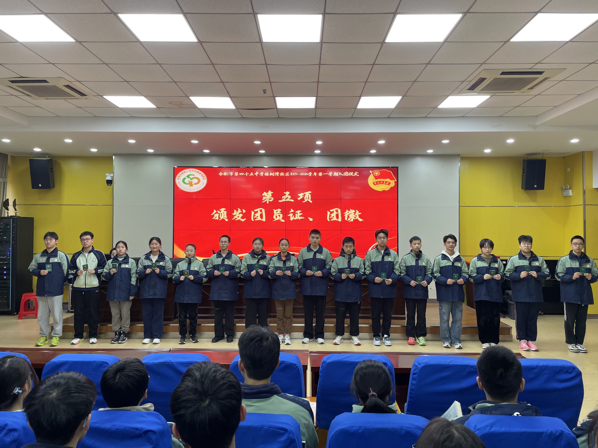 团歌结束后,团委副书记葛平平上台,庄重宣读 2025—2026 学年第一学期入团决定,并向即将加入共青团的同学们表示祝贺。紧接着,“佩戴团徽” 环节温馨展开,老团员代表有序上台,为新团员代表郑重佩戴团徽,同时递上鲜红的团员证。新团员们双手接过这份象征荣誉与责任的 “礼物”,向老团员代表深深鞠躬致谢,这一鞠躬既是对老团员的感谢,更是对传承共青团精神的坚定承诺。