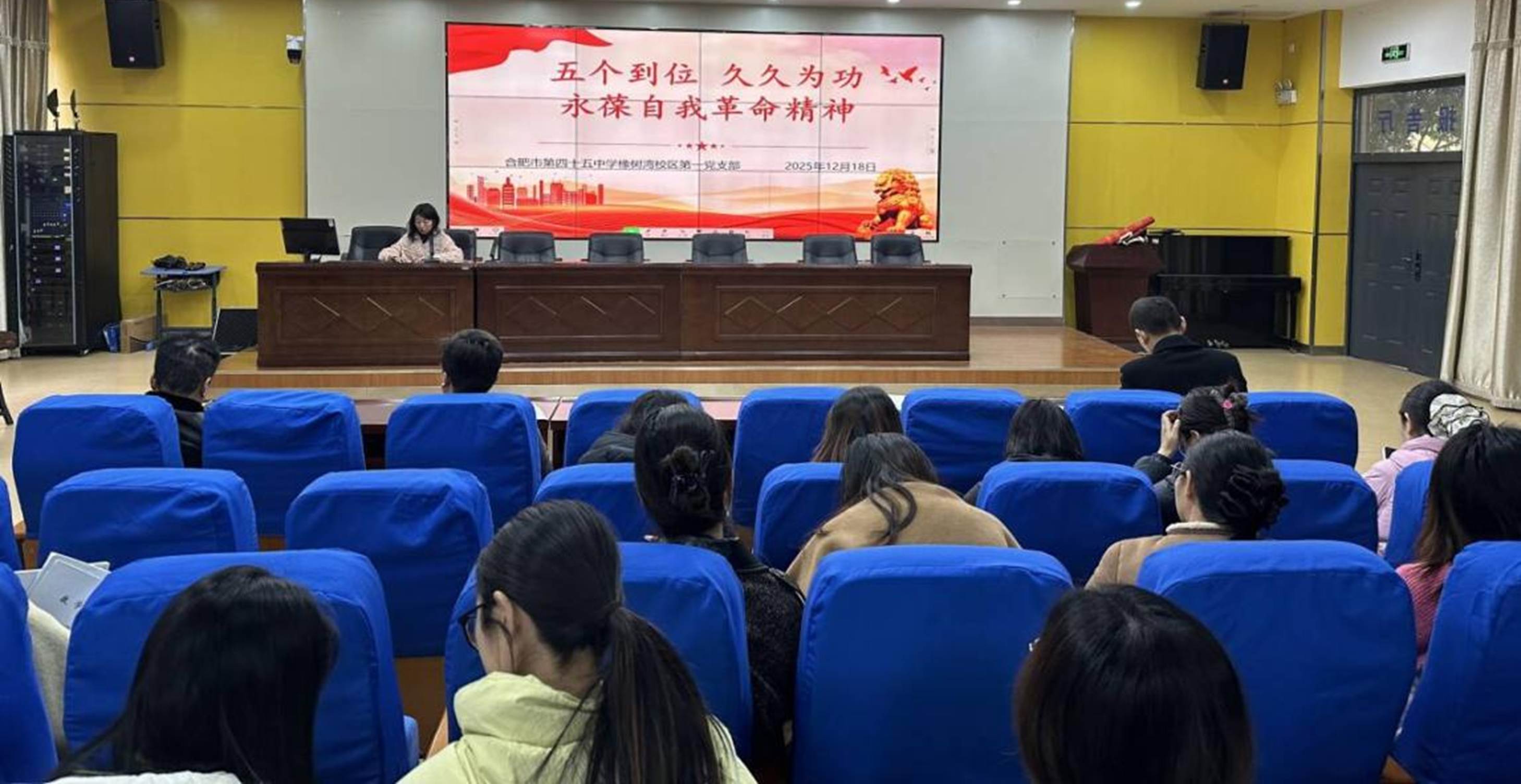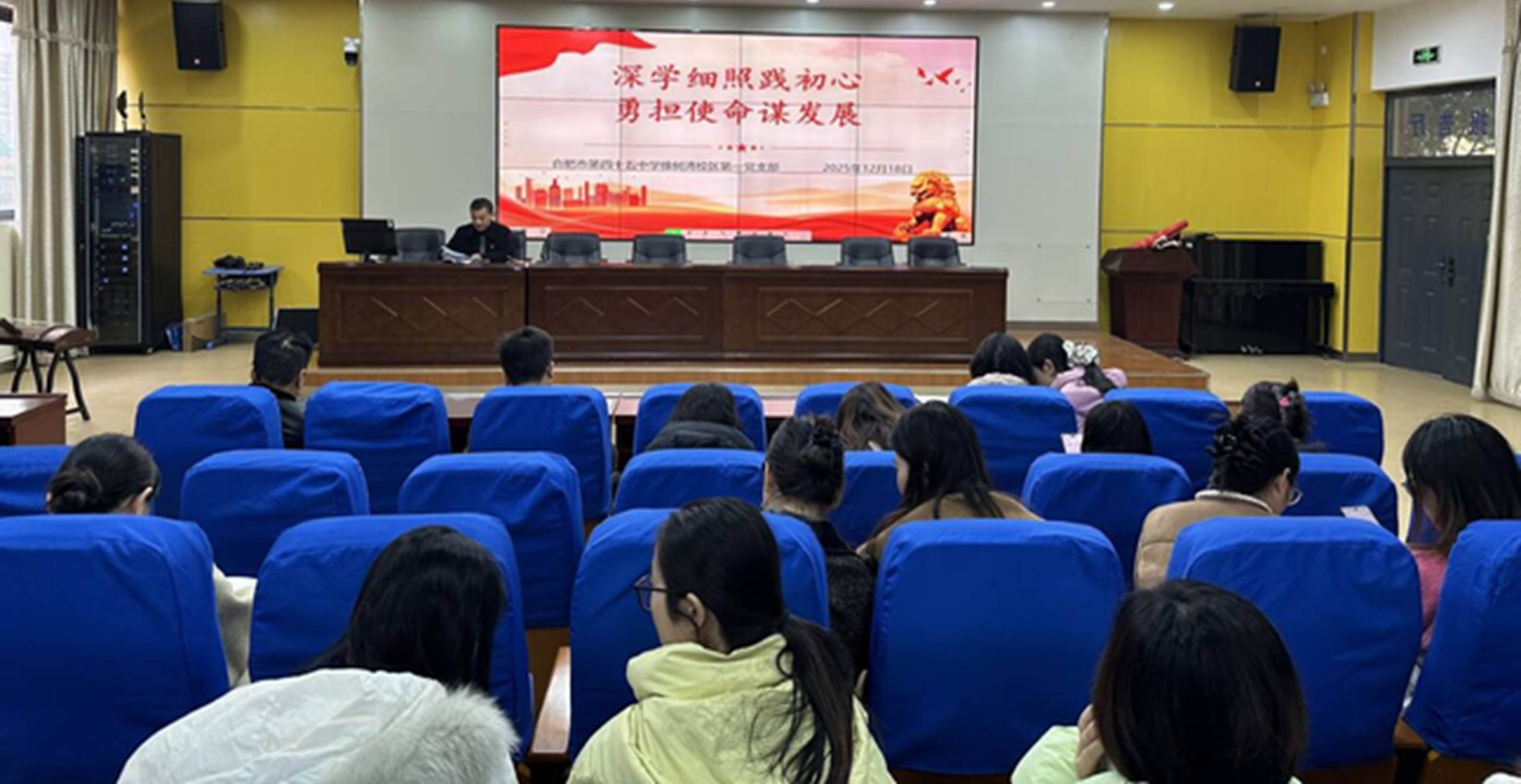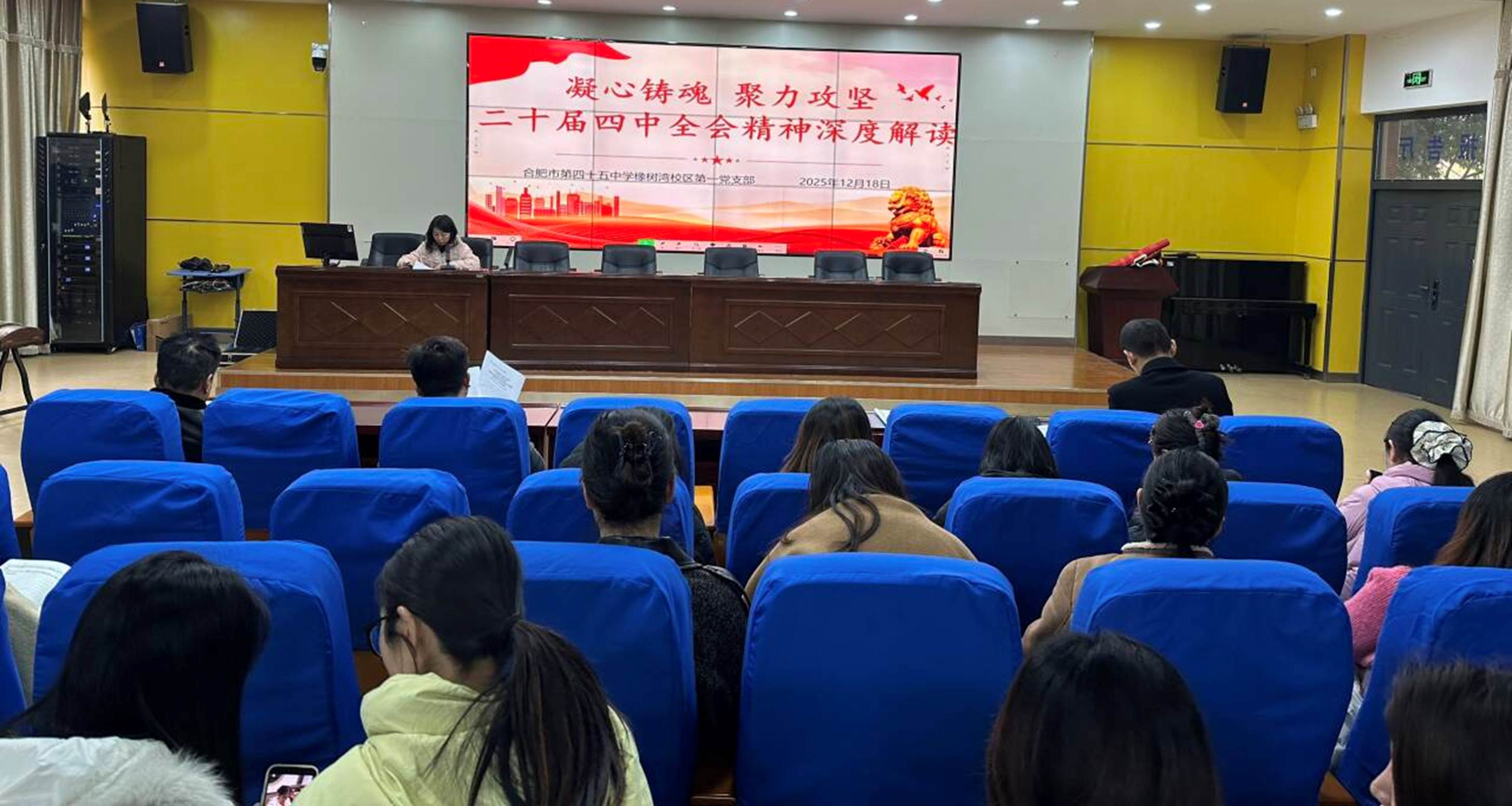 2025年12月18日,合肥市第四十五中学橡树湾校区第一党支部在学校报告厅举行主题党日专题学习会,开展深入学习研讨,强化广大党员教师理论武装,凝聚干事创业合力。