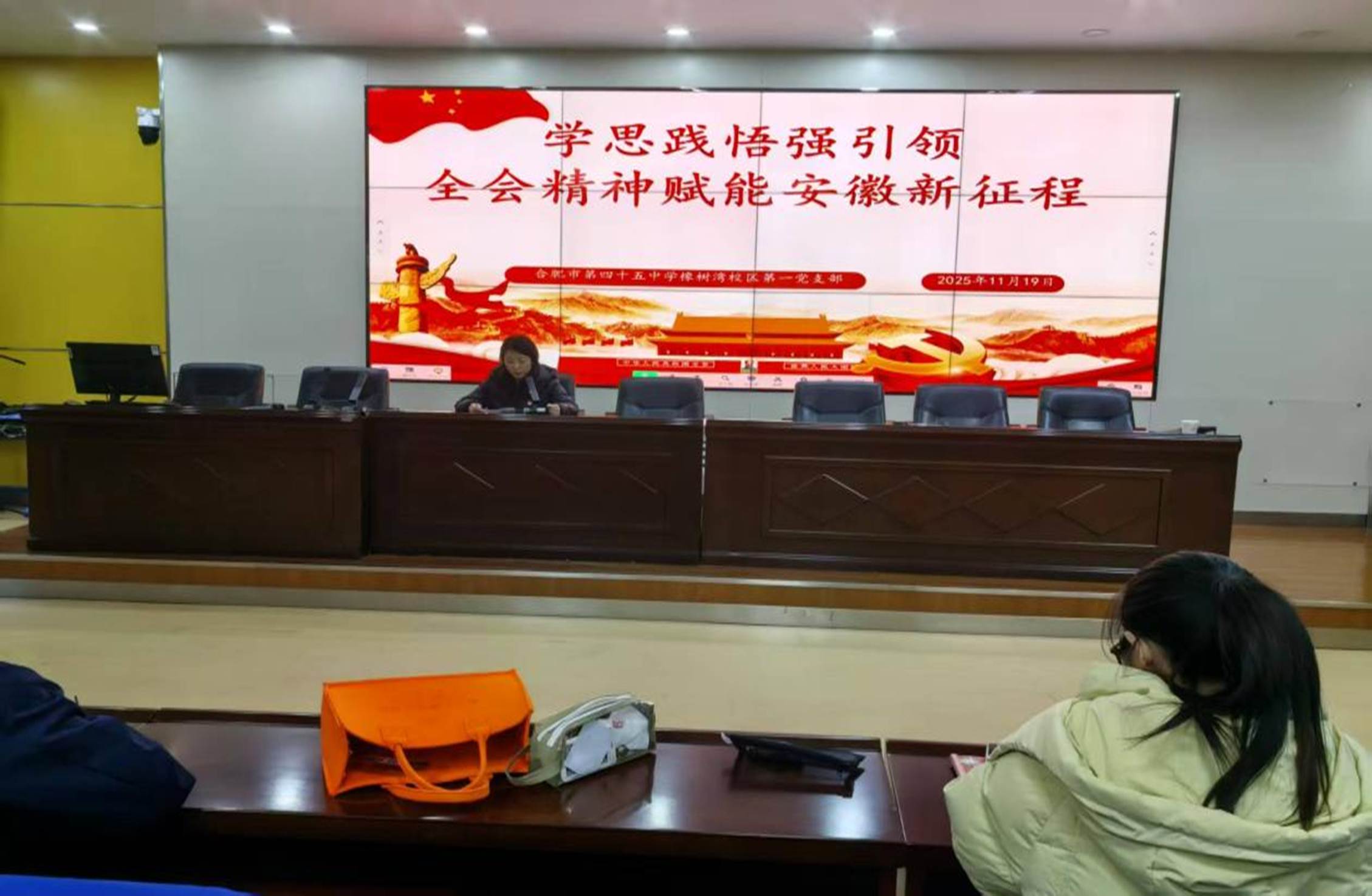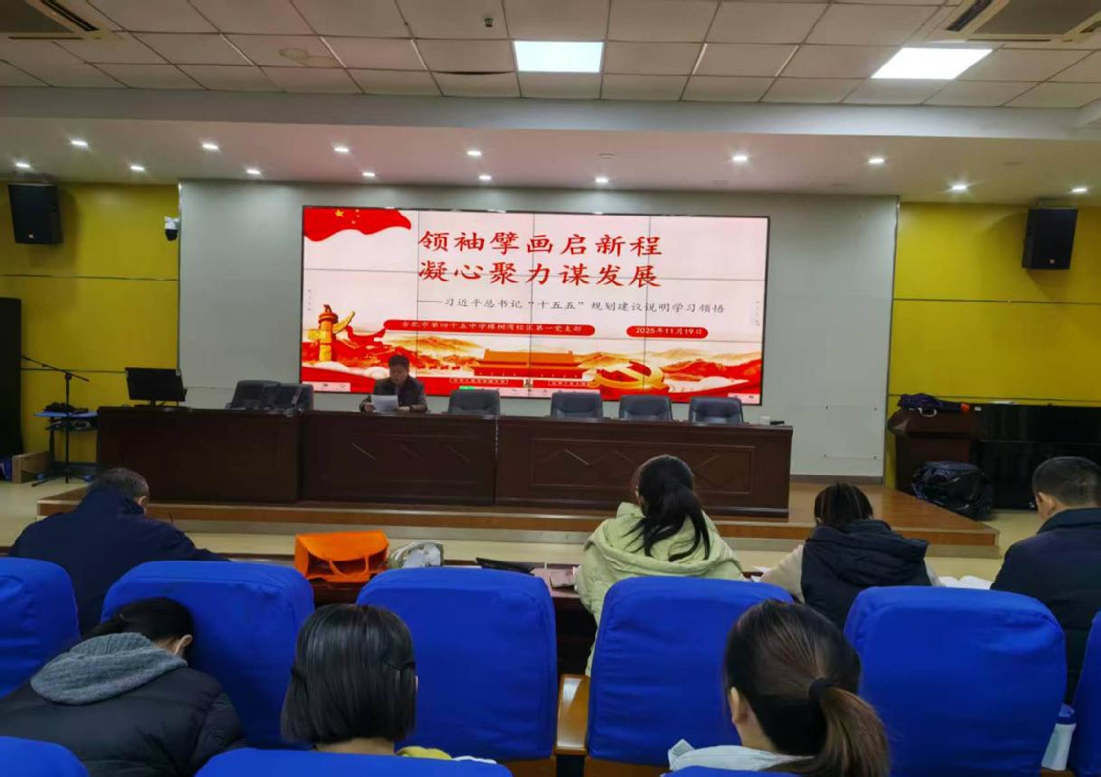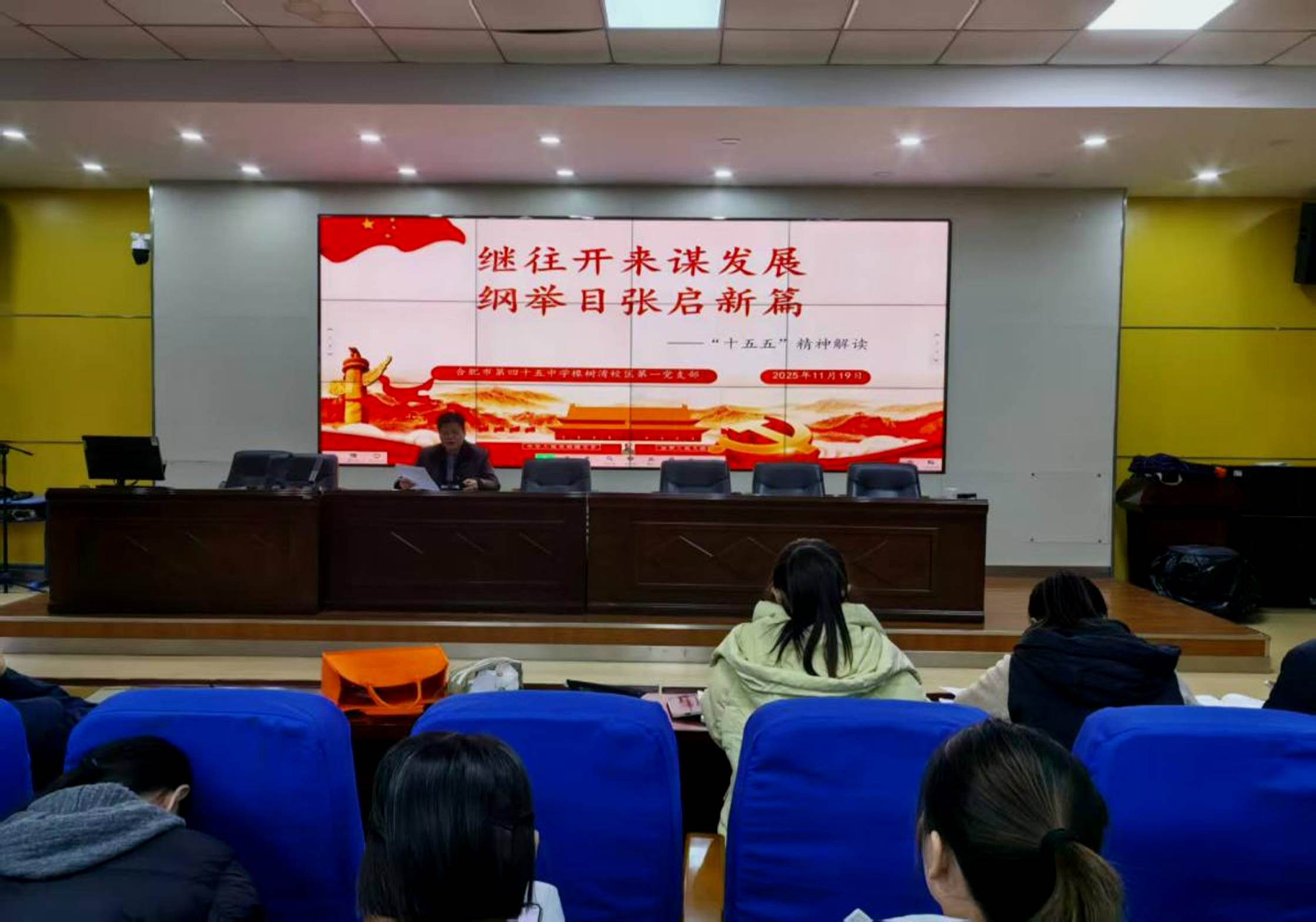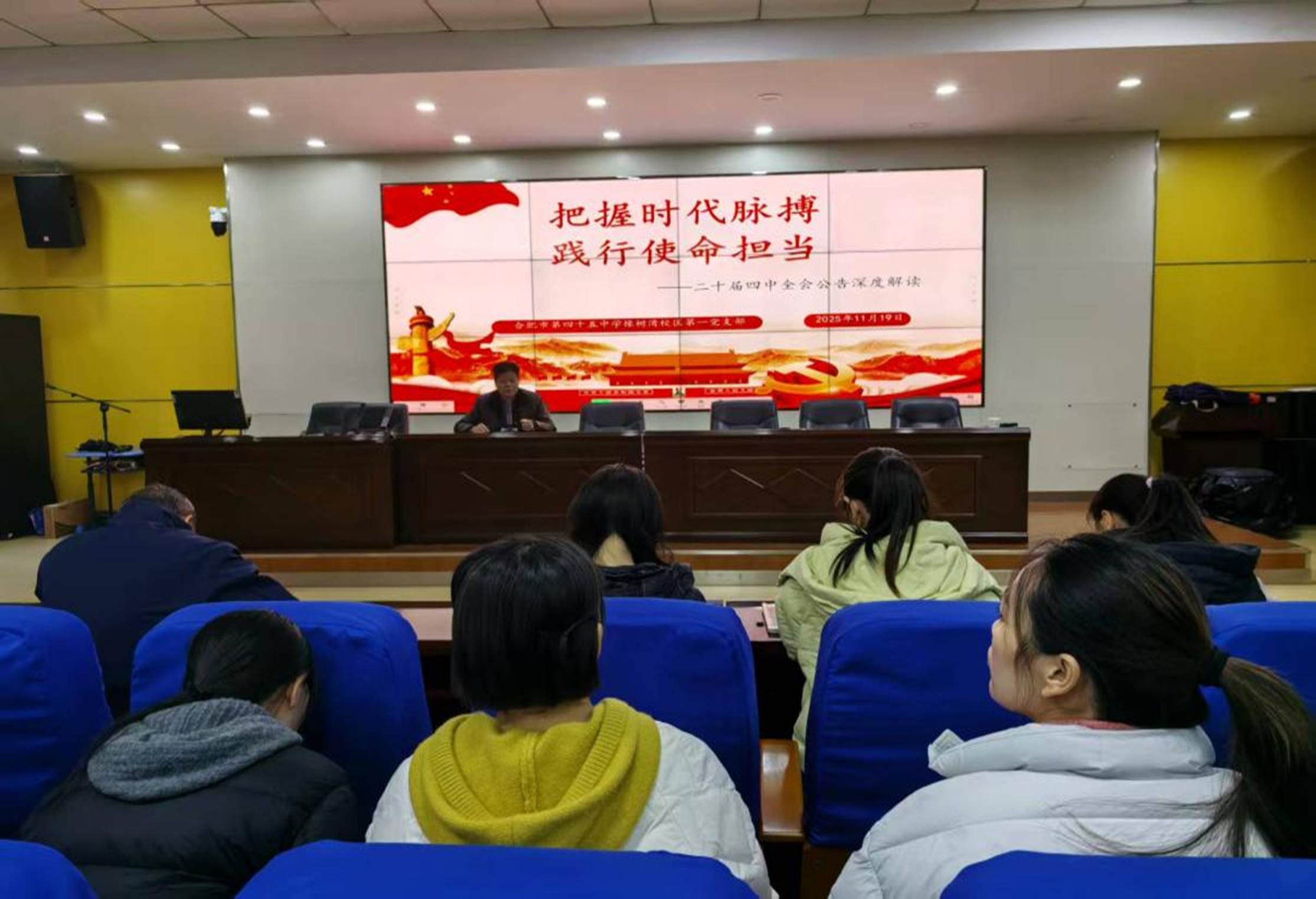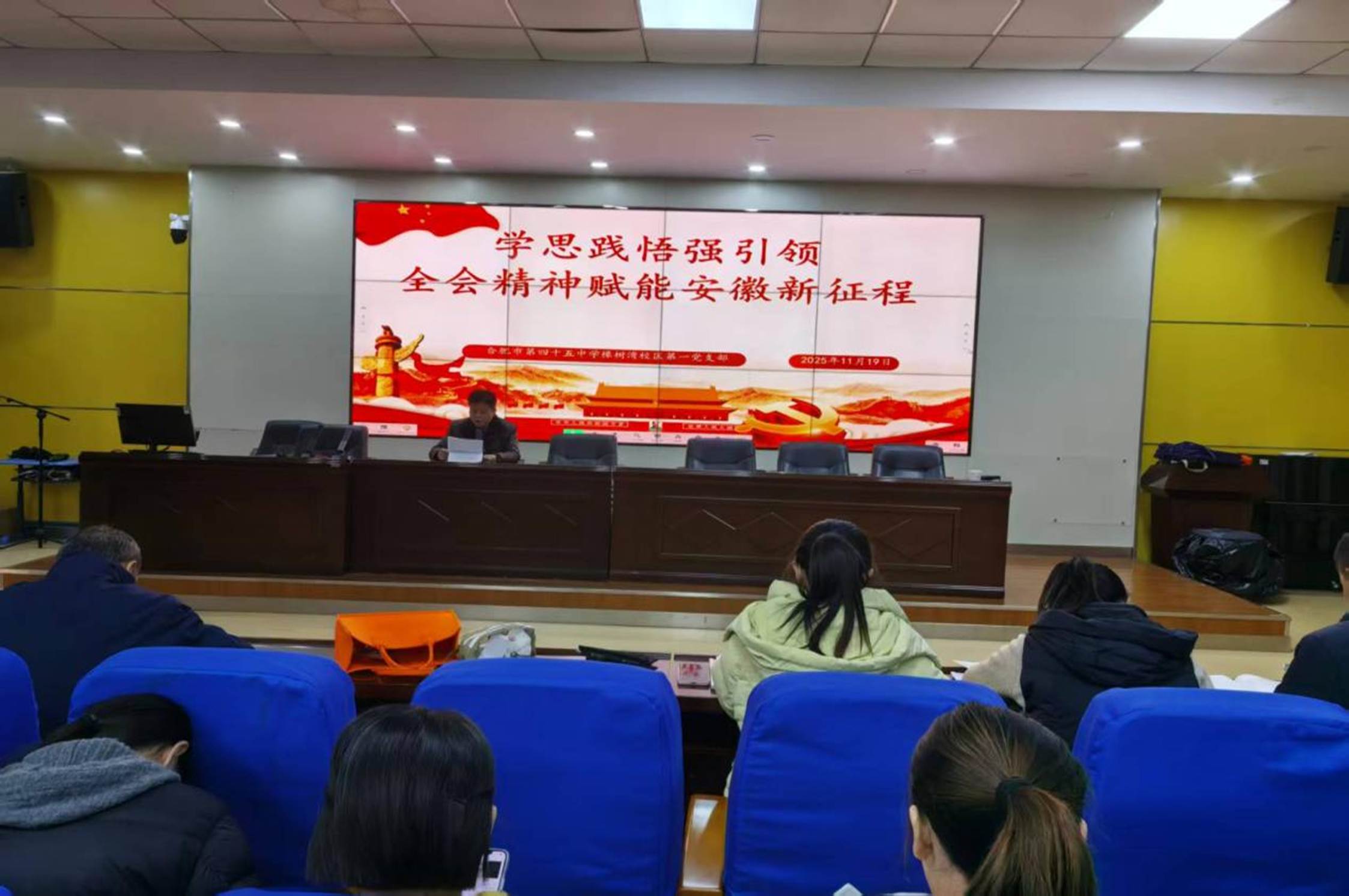 为深化理论学习、凝聚育人合力,2025年11月19日,合肥市第四十五中学橡树湾校区第一党支部在学校报告厅开展以“学全会精神 担教育使命”为主题,开展专题学习活动,活动由吴捷主任主持,第一党支部文亮书记主讲。