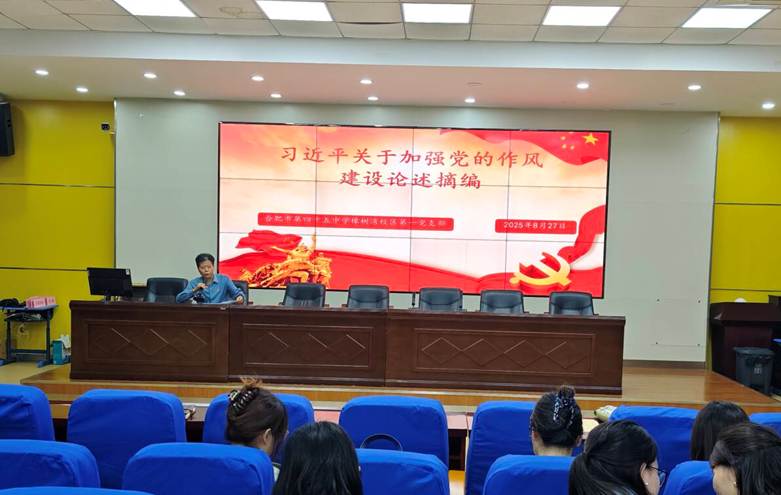 2025年8月27日下午,合肥市第四十五中学橡树湾校区第一党支部组织开展了集体学习活动,党总支副书记文亮带领全体党员同志深入学习习近平同志关于加强党的作风建设论述摘编。
