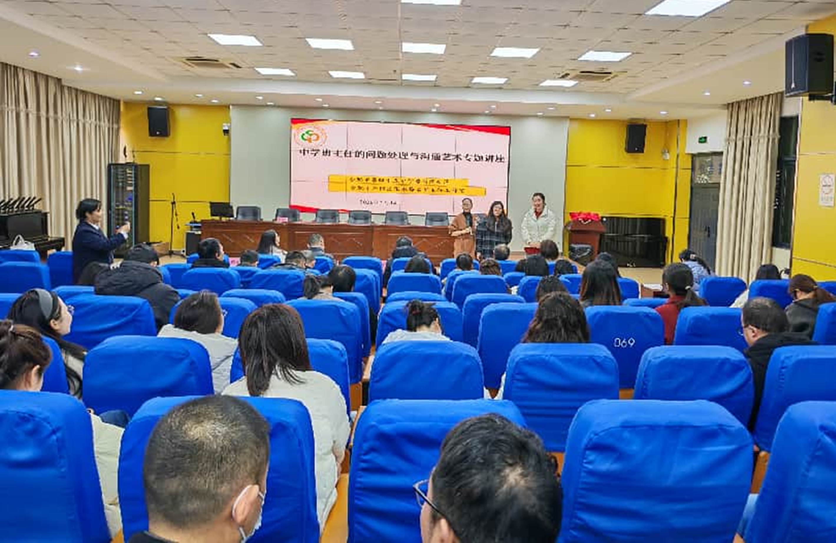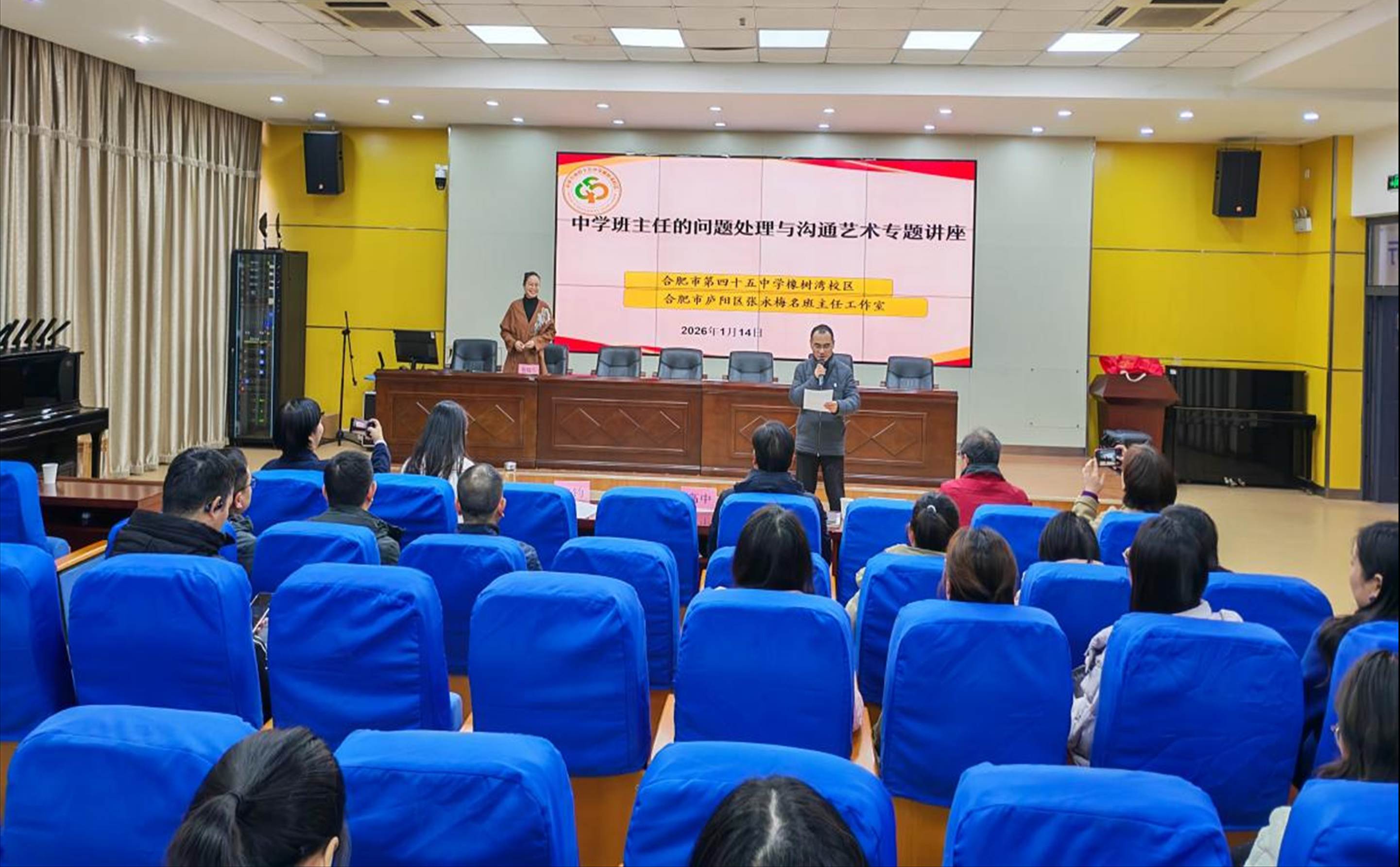 为赋能班主任专业成长,破解班级管理与师生沟通中的实际难题,2026年1月14日下午,合肥市第四十五中学橡树湾校区携手庐阳区张永梅名班主任工作室,共同举办“中学班主任的问题处理与沟通艺术”专题培训讲座。本次活动特邀程晓兰专家担任主讲嘉宾,全校班主任齐聚一堂,共同探索班级管理的科学方法与沟通技巧。