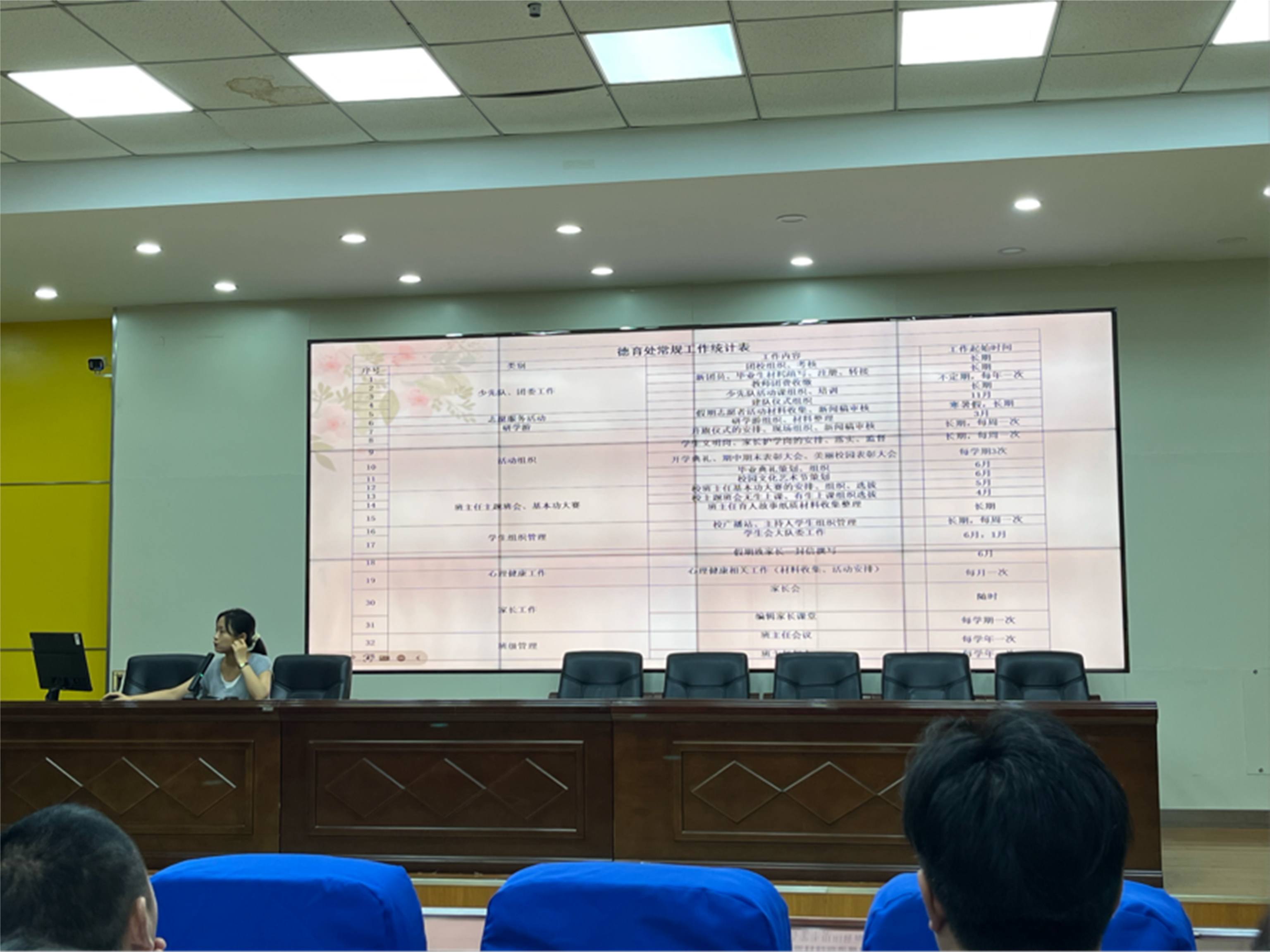 最后,教务处高中主任就学校教科研活动进行介绍,明确了各级各类各项的教研活动安排。同时,详细展示了学校教学检查的要求,涵盖教案、课件、作业批改等多个方面。他还对新进教师提出期许,希望大家能“快速站稳讲台,积极协调沟通,合理安排时间”,在教育教学的道路上尽快成长。