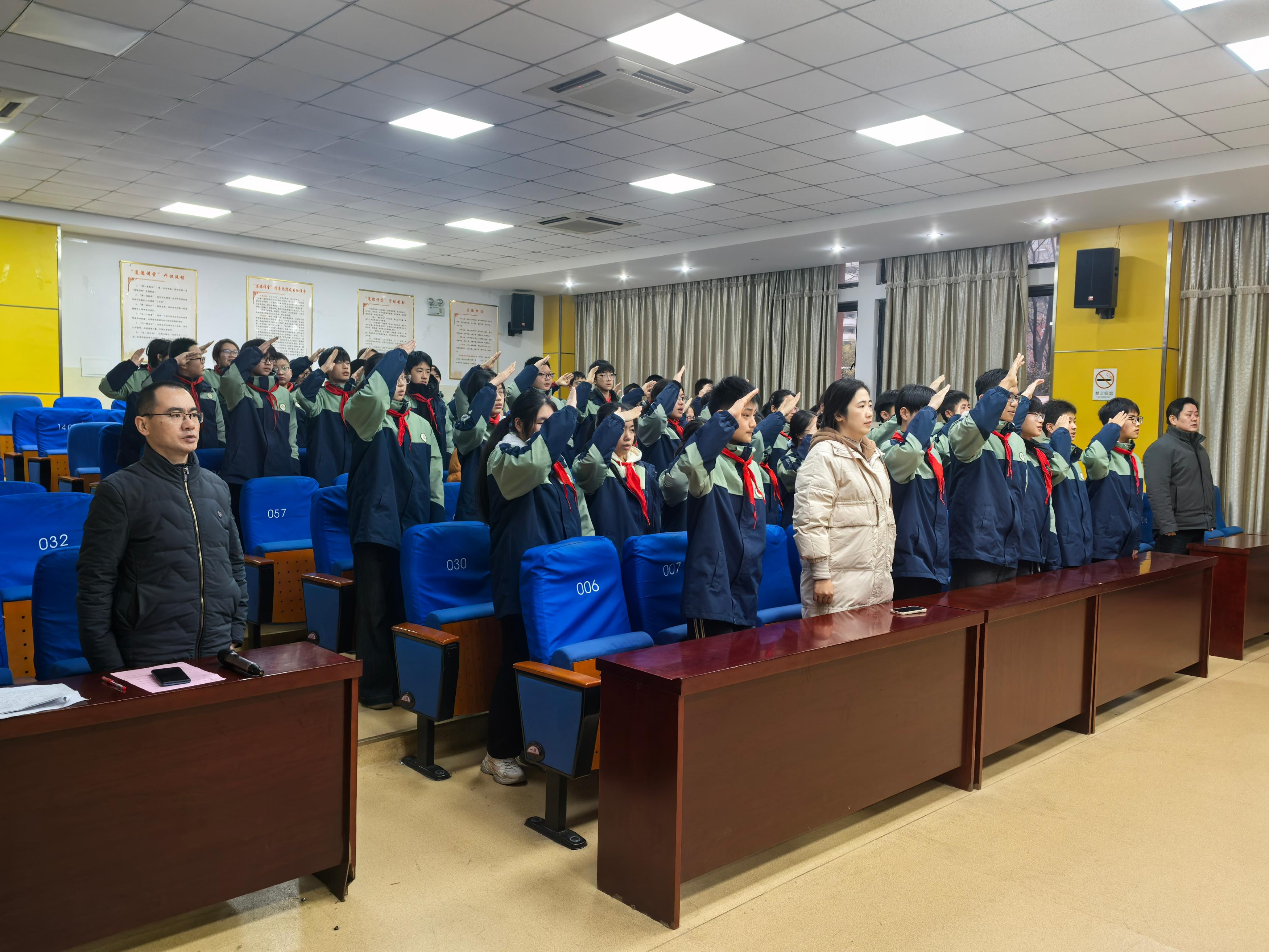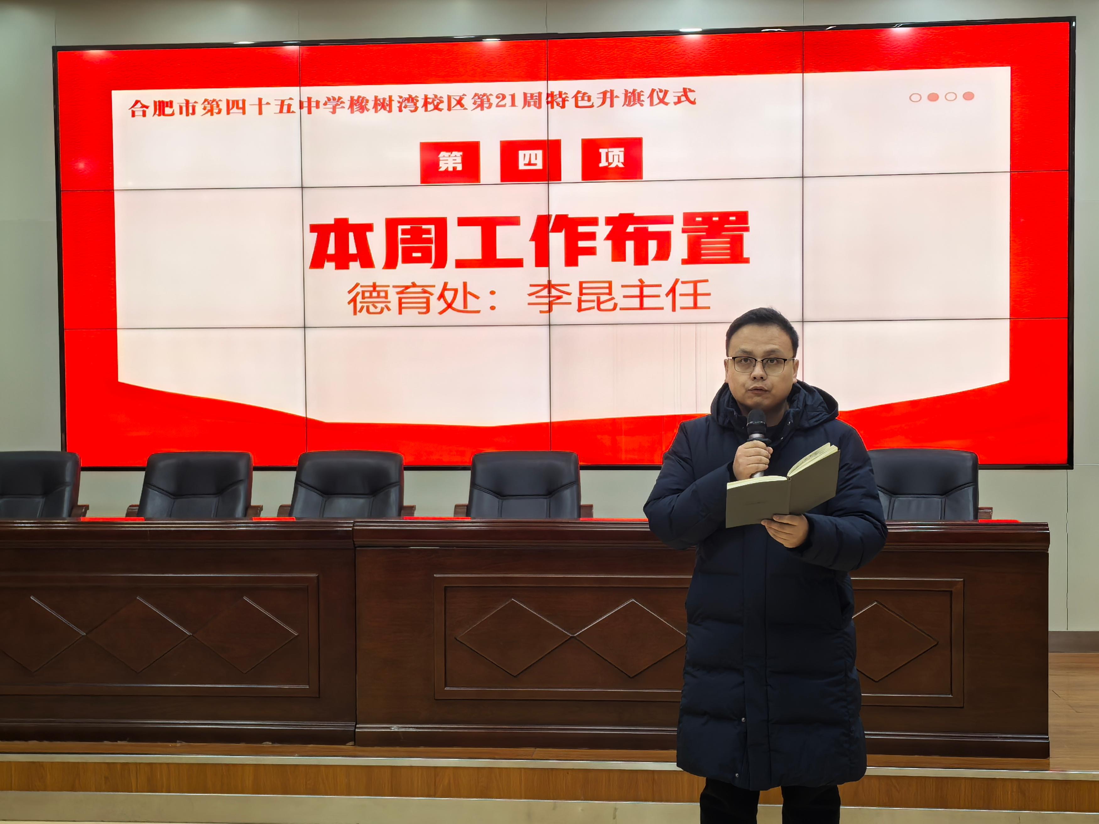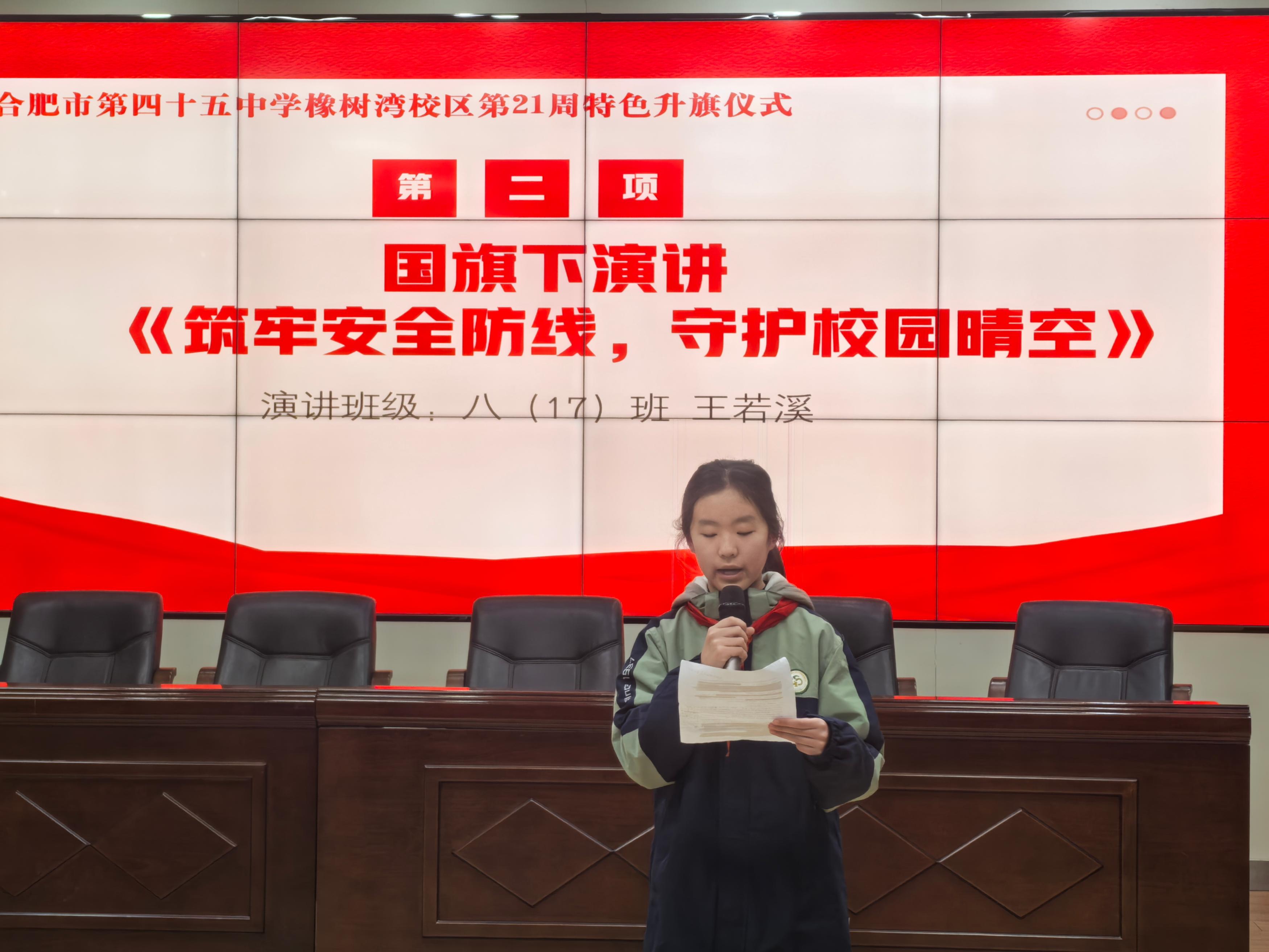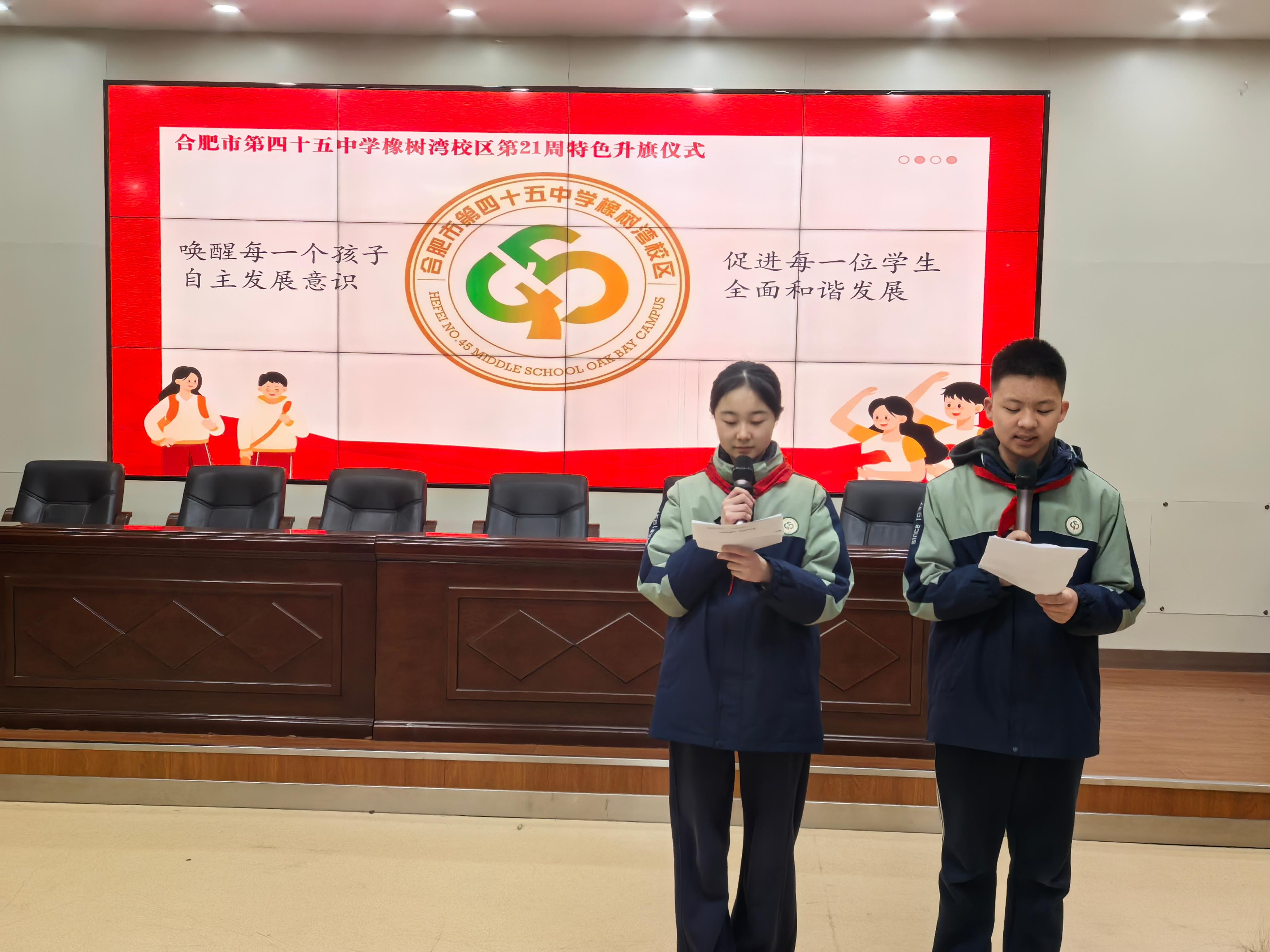 寒雨浸冬,暖意盈心。1月19日,合肥市第四十五中学橡树湾校区举办以“筑牢安全防线,守护校园晴空”为主题的升旗仪式,全体师生齐聚一堂,在庄重而有序的氛围中接受安全理念的浸润与青春力量的感召。活动由八(17)班承办,八(13)班叶悠然、八(18)班黄怡涵两位同学担任主持人。