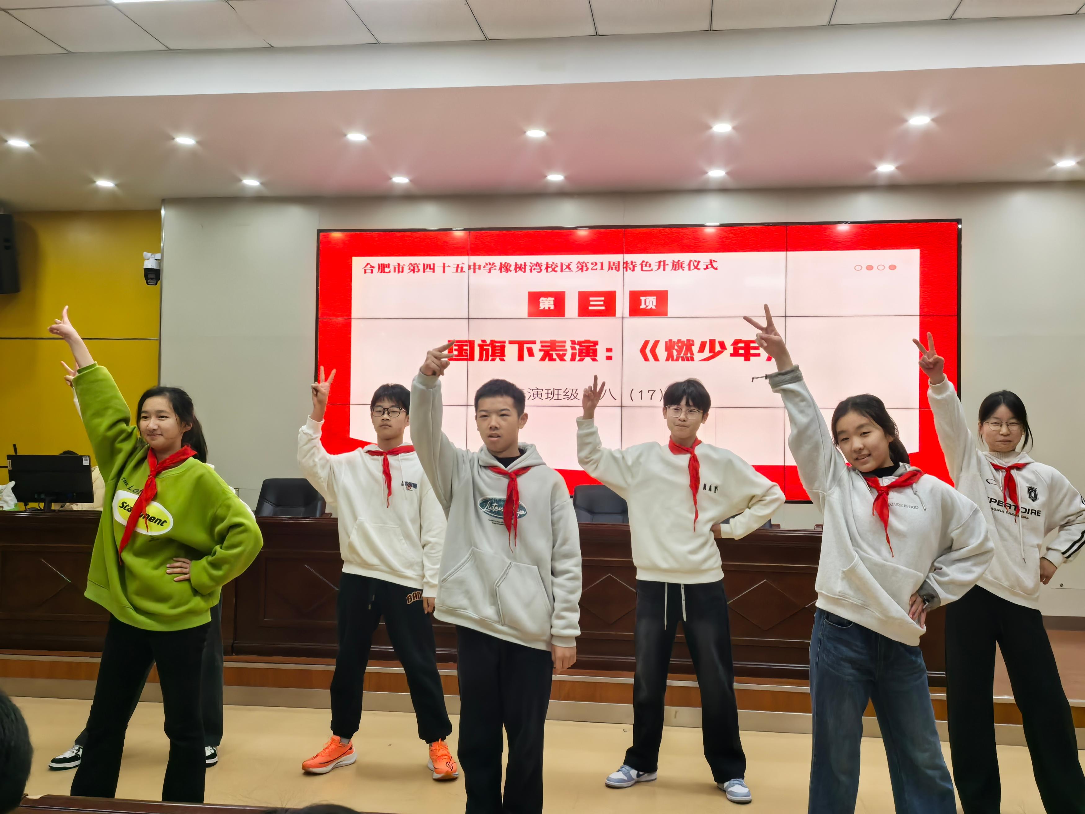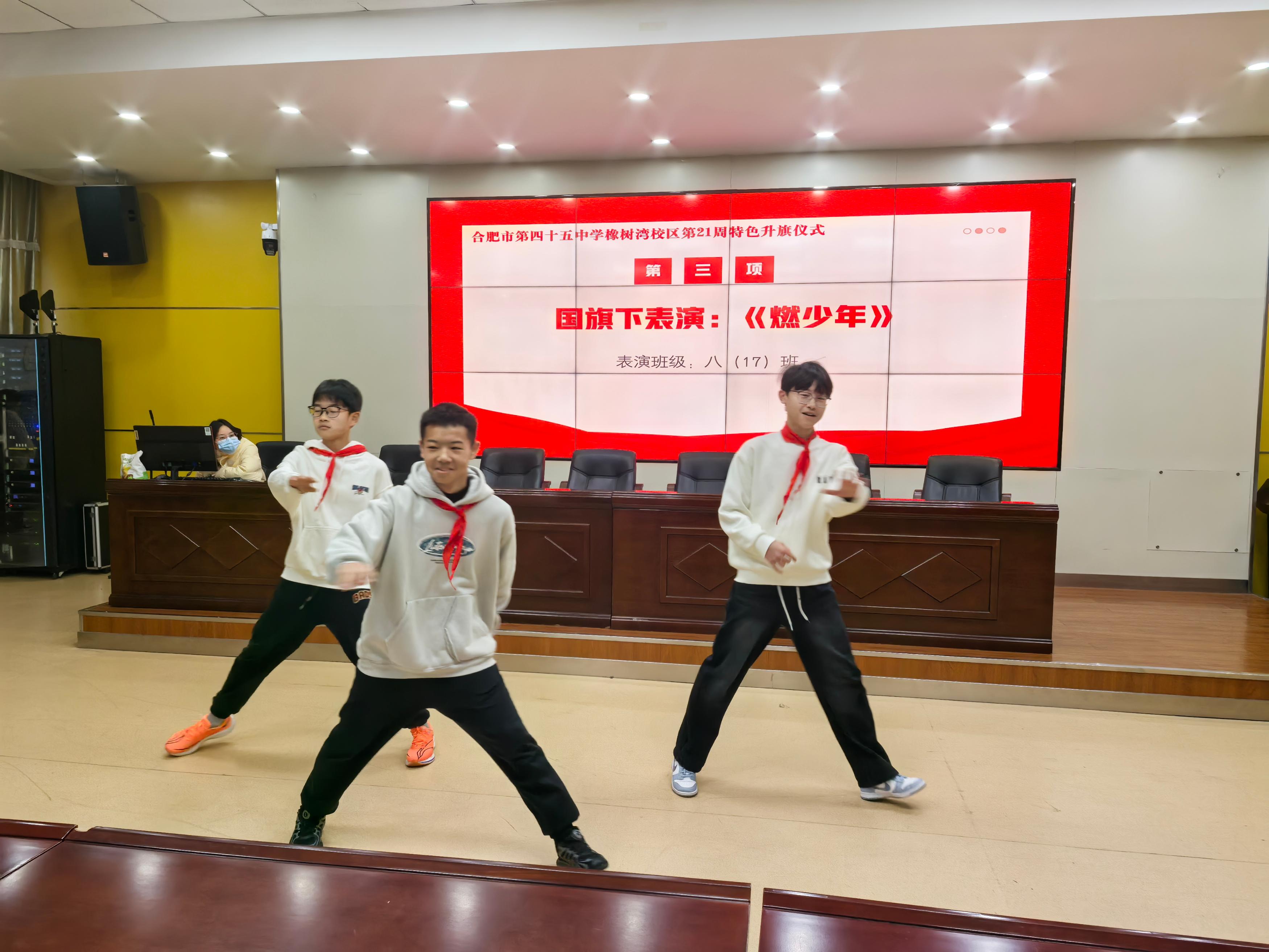 演讲结束后,八(17)班学子带来的舞蹈串烧《燃少年》瞬间点燃现场氛围。同学们以动感十足的舞姿、饱满的热情、整齐划一的动作,展现了青春的蓬勃朝气与积极向上的精神风貌。
