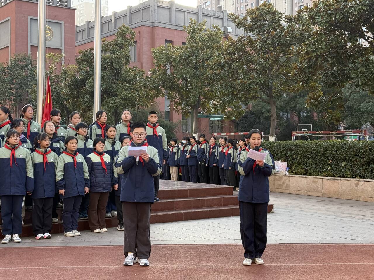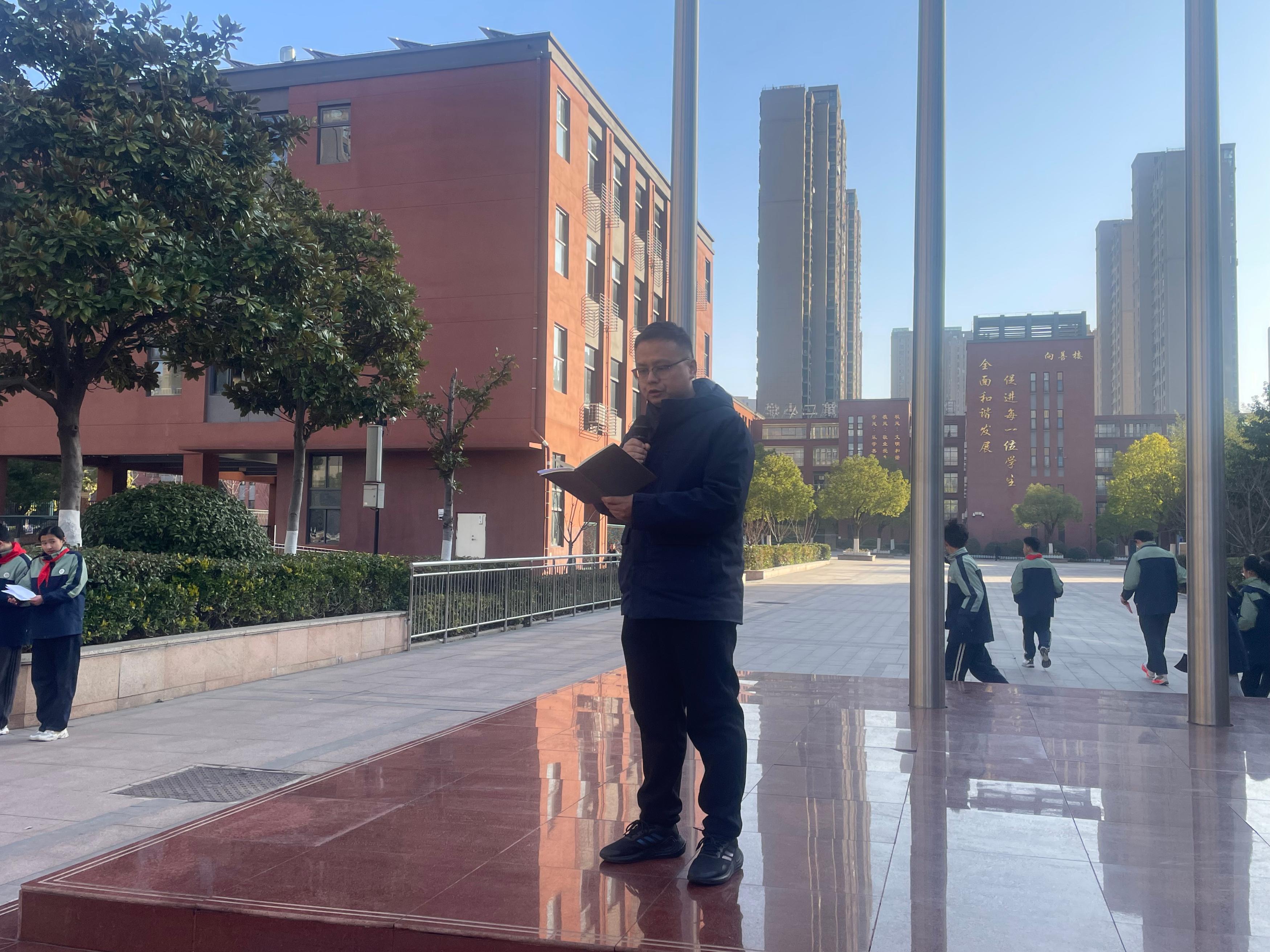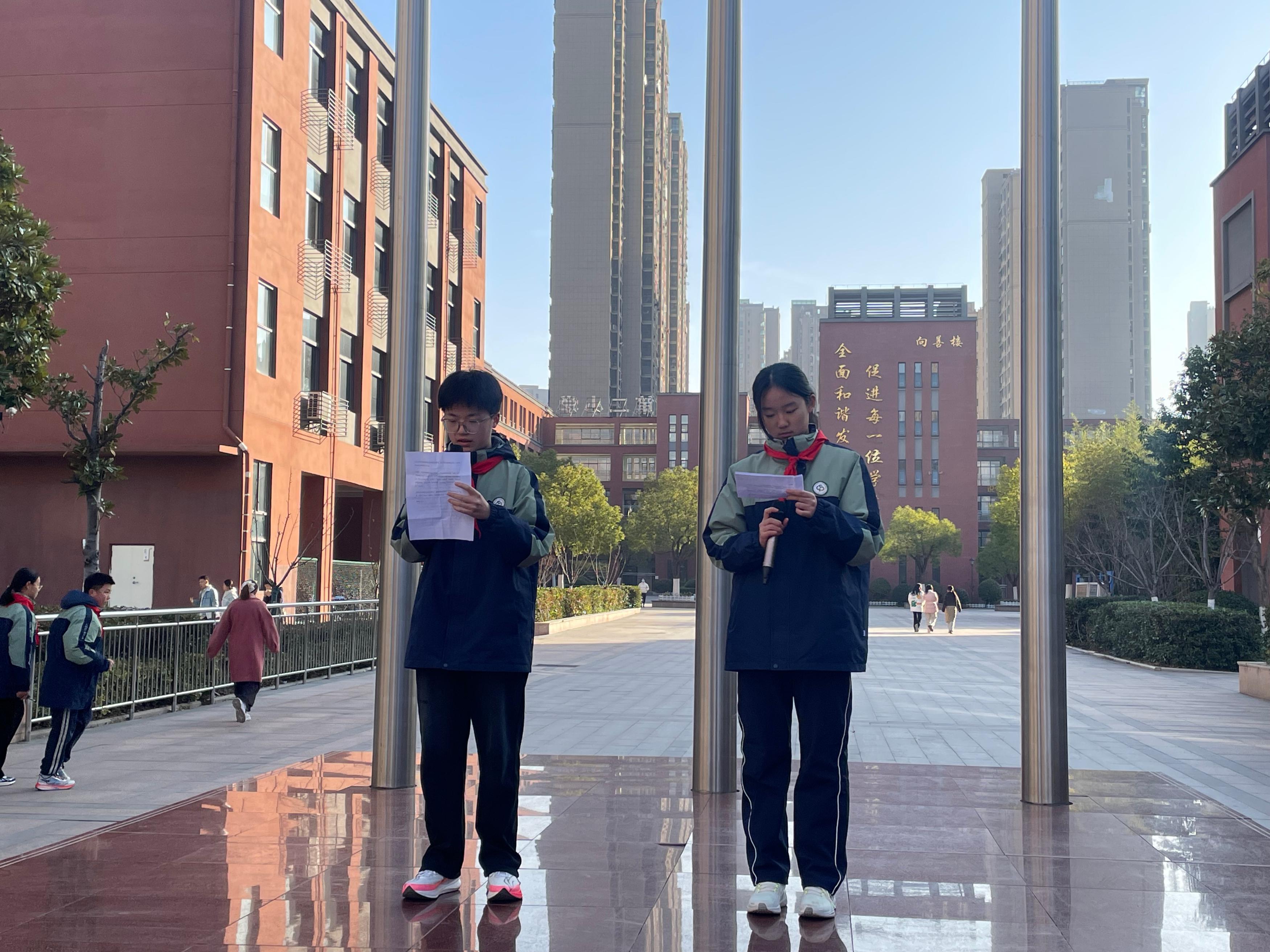 冬至佳节将至,暖意流淌校园。2025年12月15日上午8时40分,合肥市第四十五中学橡树湾校区全体师生齐聚操场,隆重举行了以“迎冬至佳节,赏趣味灯谜”为主题的第十六周特色升旗仪式。本次升旗仪式由八(12)班全体同学承担,八(17)班冯云姝、八(9)班洪世龙两位同学担任主持人。