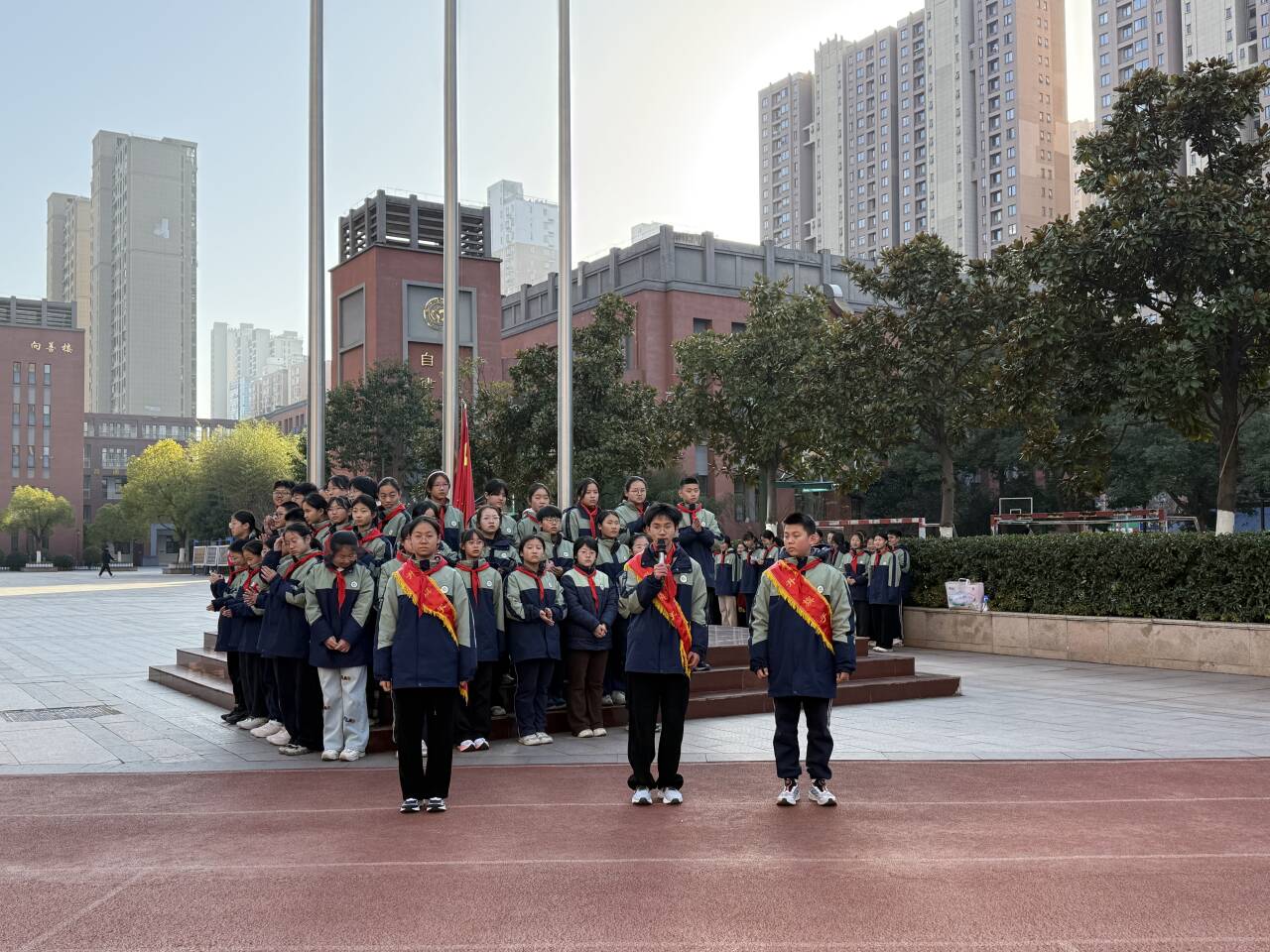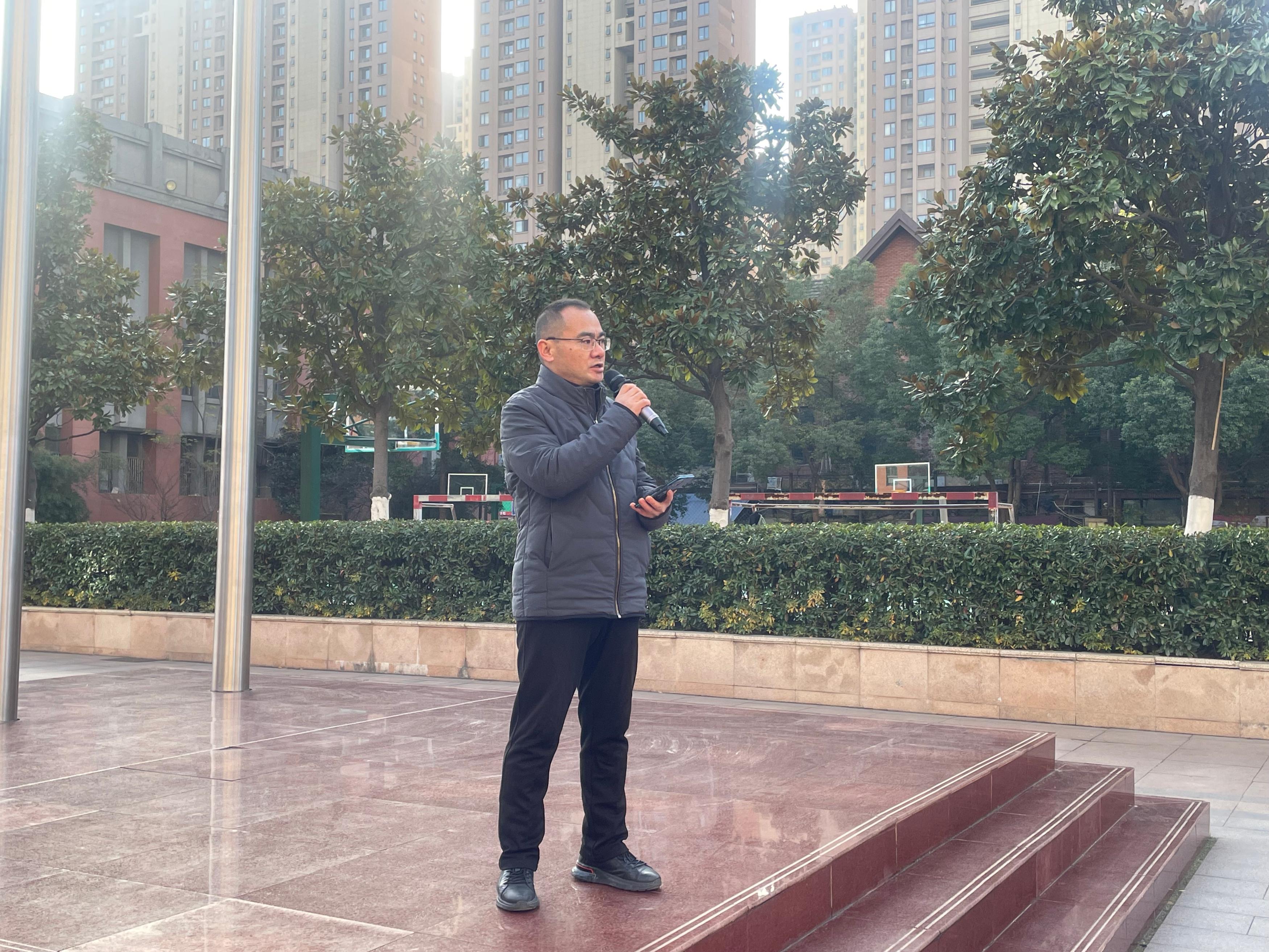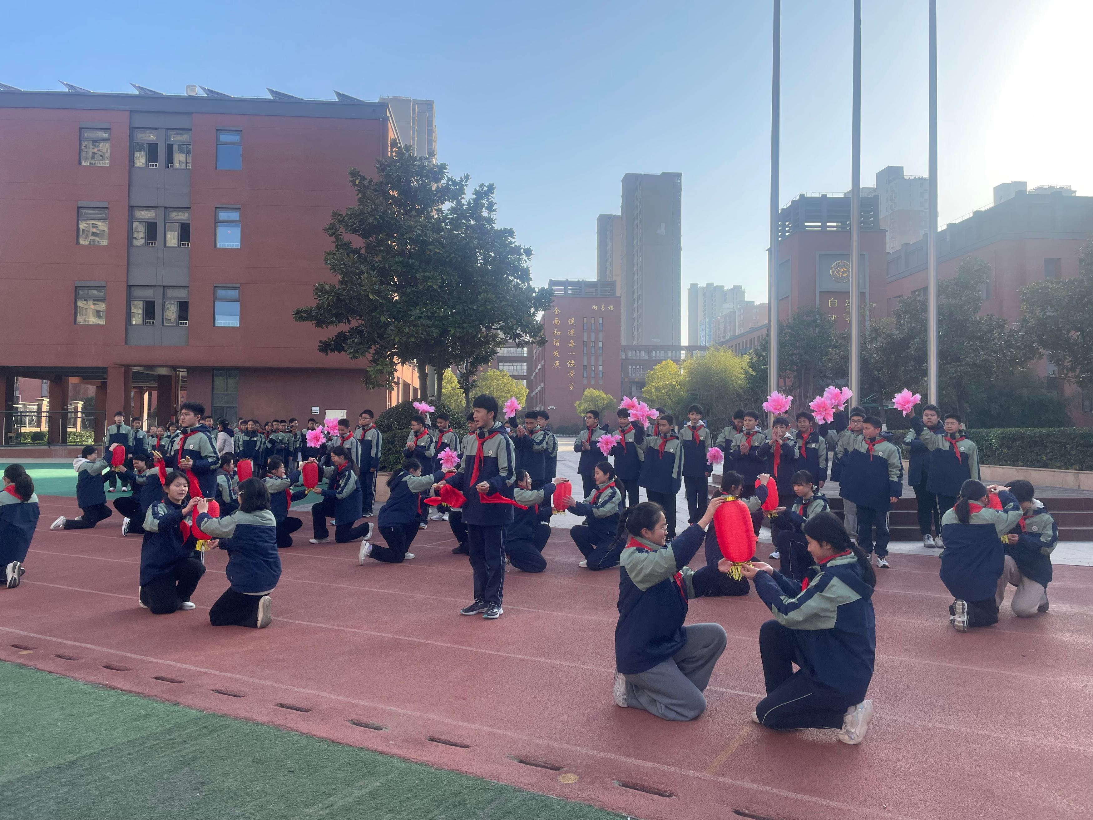冬至佳节将至,暖意流淌校园。2025年12月15日上午8时40分,合肥市第四十五中学橡树湾校区全体师生齐聚操场,隆重举行了以“迎冬至佳节,赏趣味灯谜”为主题的第十六周特色升旗仪式。本次升旗仪式由八(12)班全体同学承担,八(17)班冯云姝、八(9)班洪世龙两位同学担任主持人。