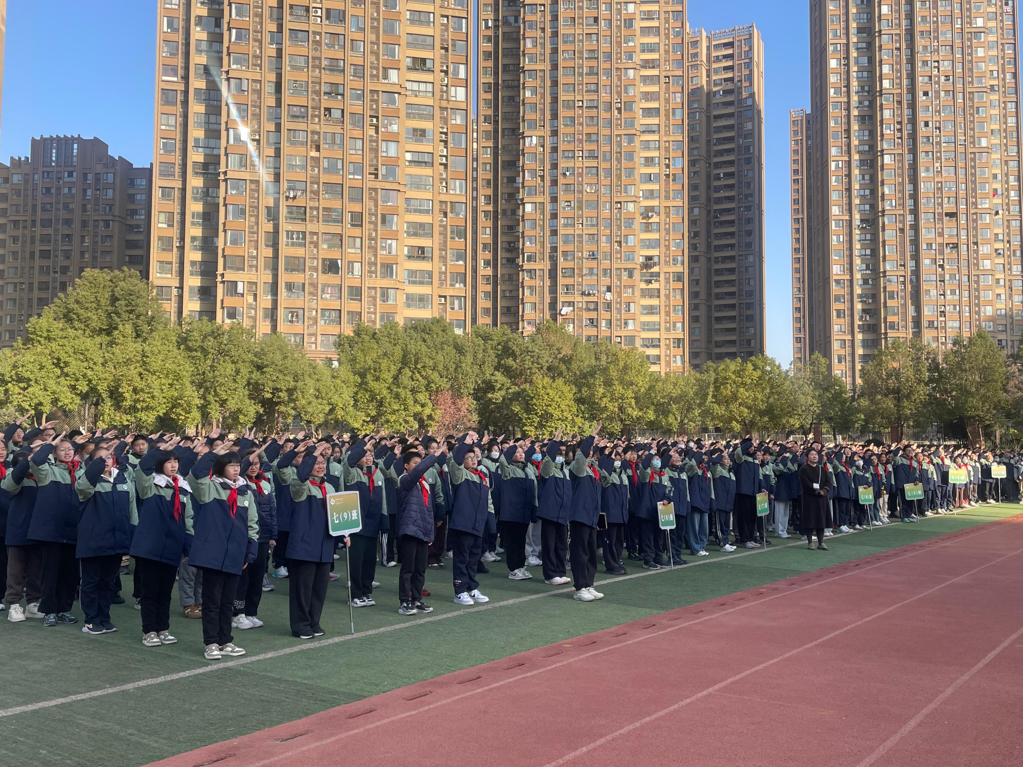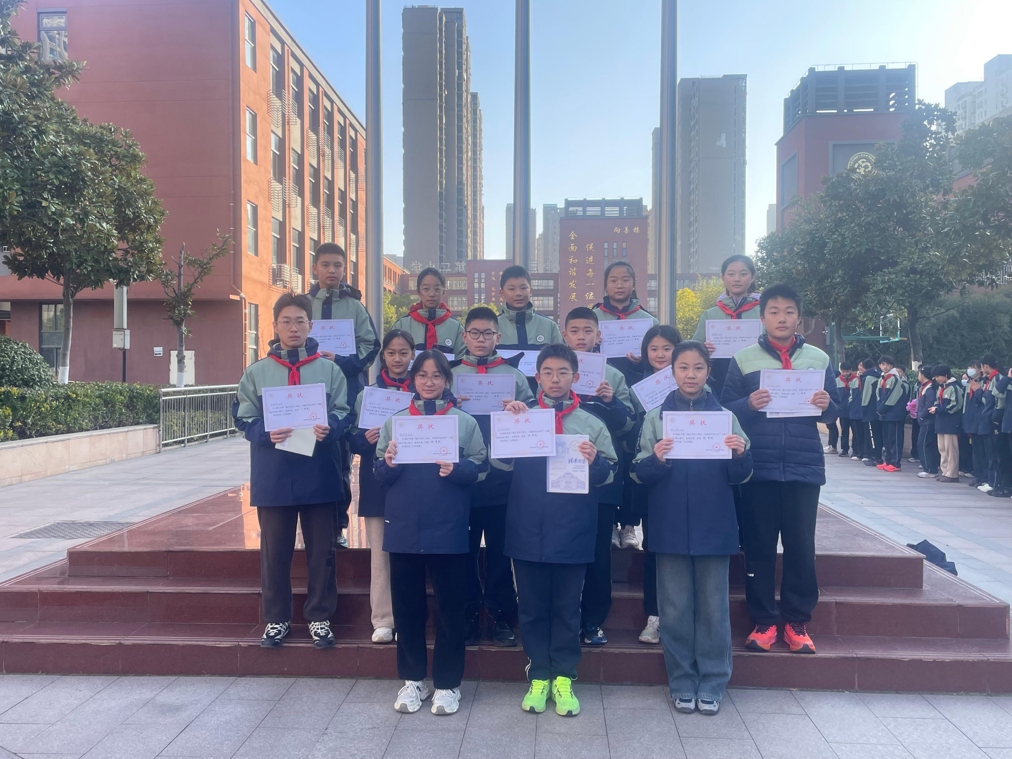 活动在庄严的升旗仪式中拉开序幕。八(12)班的周梓芯、韩峪森、代明宇三位同学担任升旗手。他们步伐铿锵,神情庄重,伴随着雄壮的国歌声,将五星红旗冉冉升起,展现了新时代学子昂扬的精神风貌。
