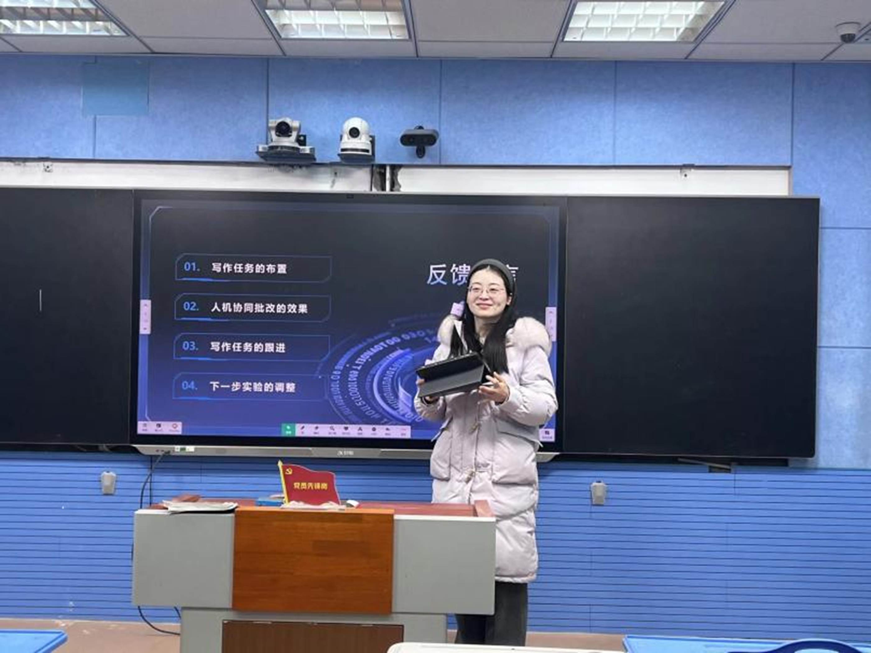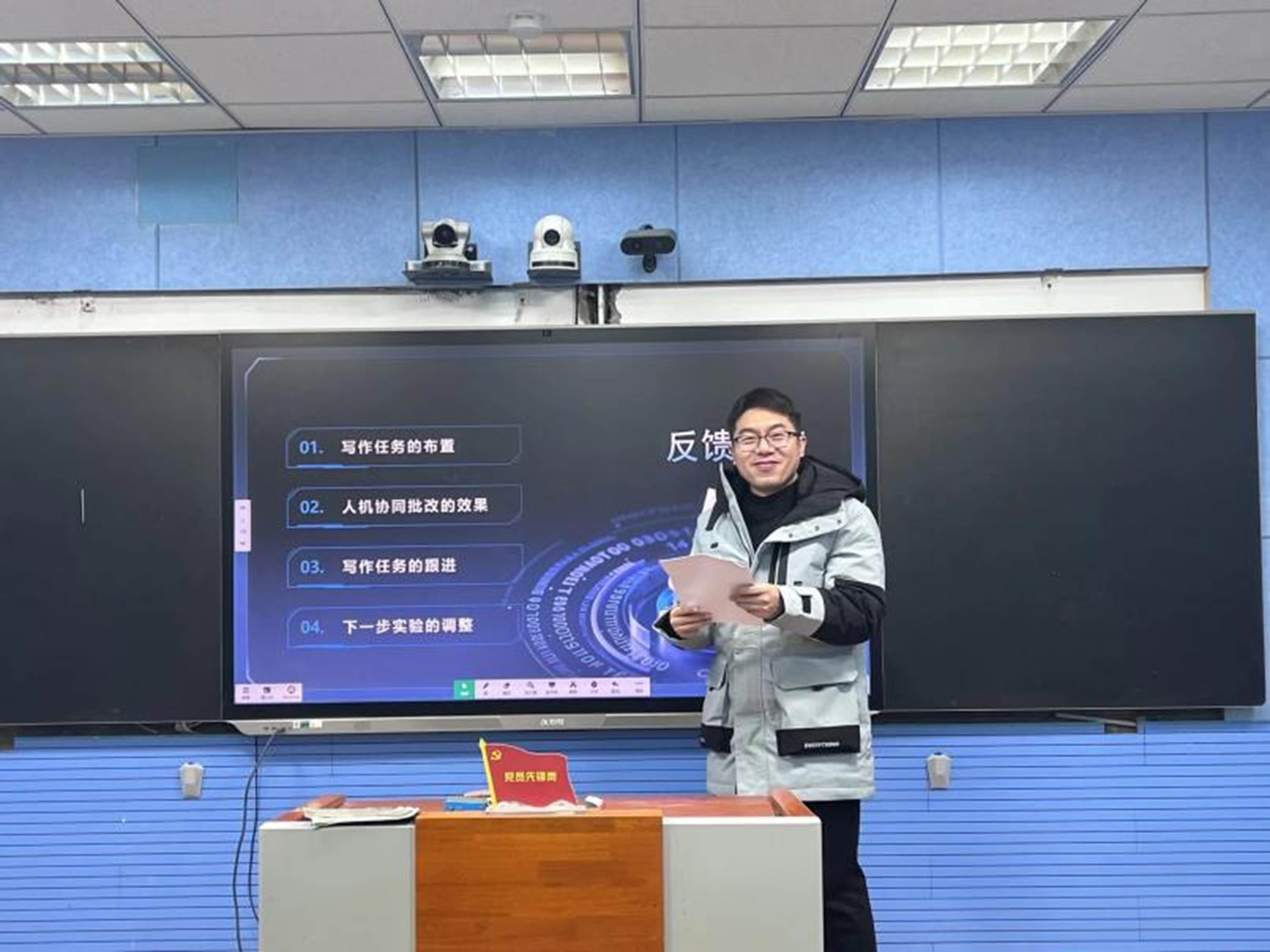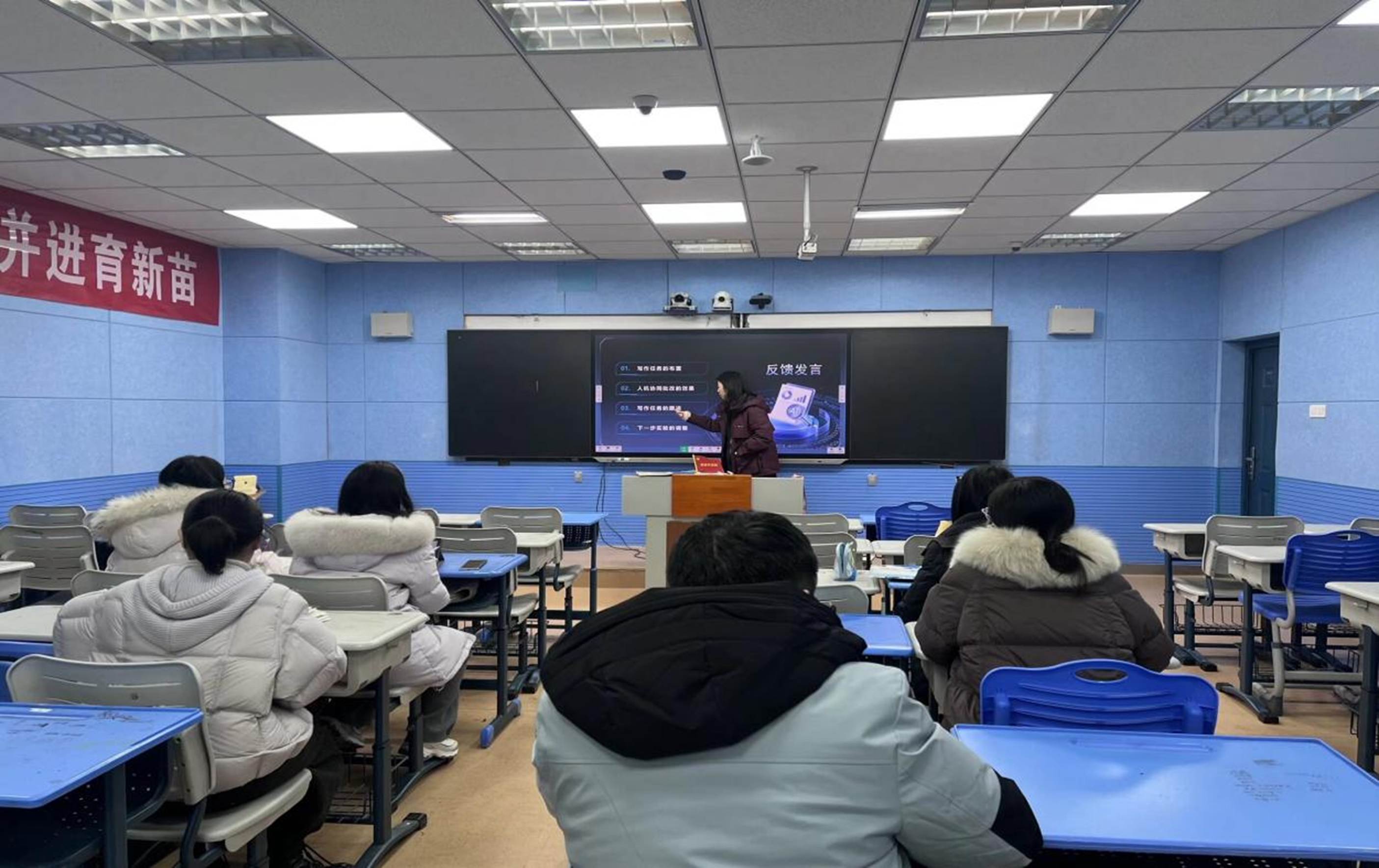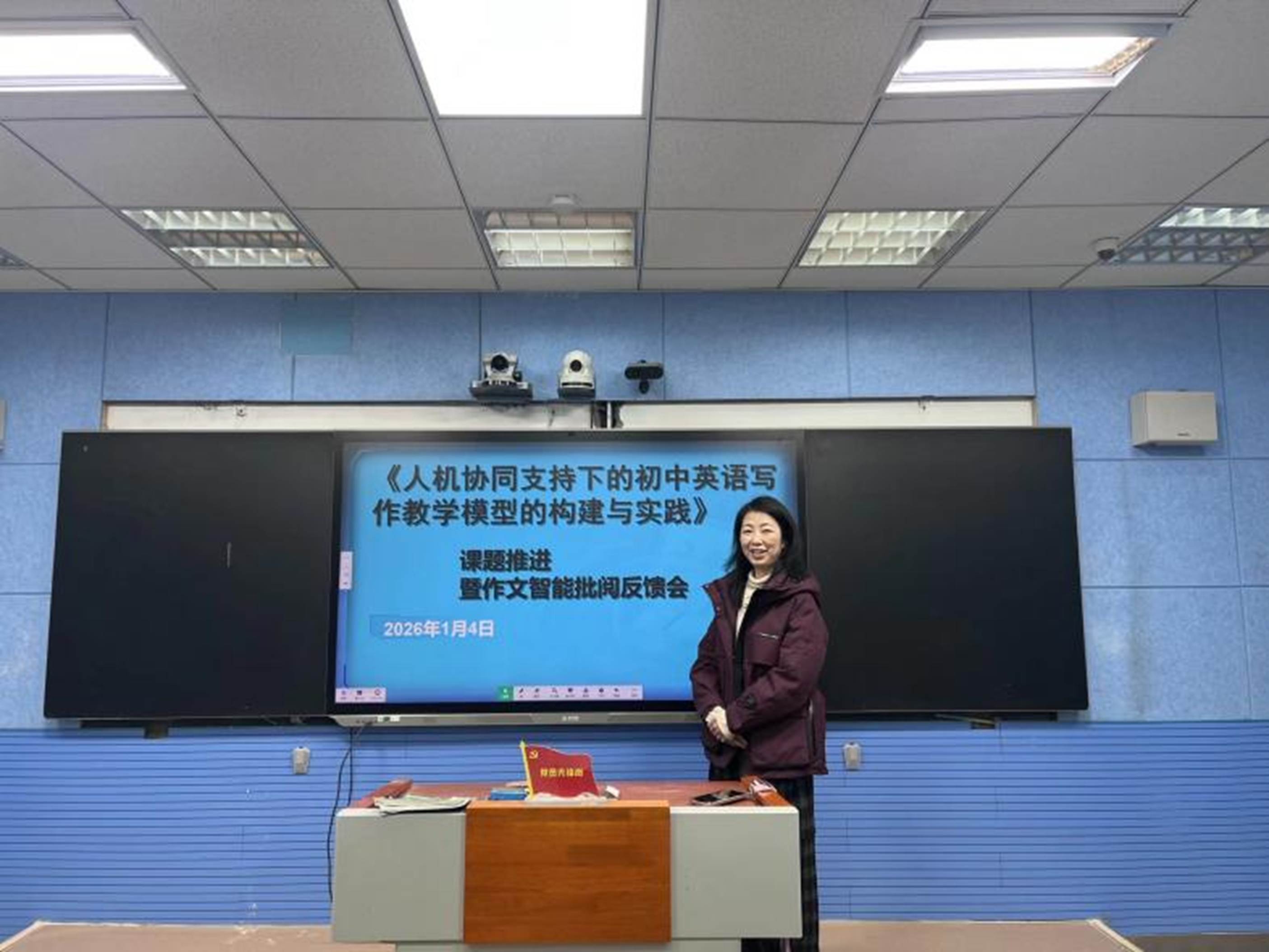 为推动课题研究向纵深发展,将人工智能技术与初中英语写作教学深度融合,2025年1月4日,《人机协同支持下的初中英语写作教学模型的构建与实践》课题推进会暨作文智能批阅反馈会在录播室成功举行。本次会议由吴捷老师主持,计婷俐、陈乐等课题组成员共同参与研讨。