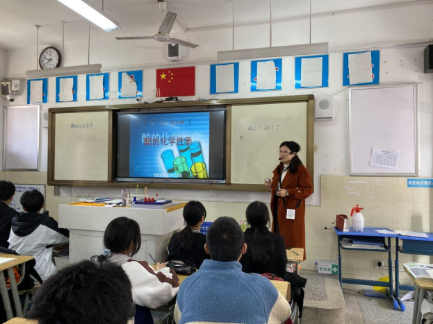 杨老师上课的课题为“酸的化学性质”。她的课全程以实验为主,让学生自主探究,先是让学生设计实验,探究无色溶液究竟是水还是稀盐酸,学生提出了很多方案,如:指示剂法,活泼金属法,加大理石等。学生的每一个方案,杨老师都让学生亲自到前面来实验验证,提高了学生学习化学的兴趣。随后,杨老师根据学生的实验总结出酸的两点化学性质:与指示剂反应,与活泼金属反应。接着,又用酸来除铁锈,并让学生观察现象,自主书写铁锈与酸的反应,再进行总结。紧接着,再总结出酸能与金属氧化物反应。最后,在回顾前面知识的基础上,介绍酸的最后两点化学性质:与盐反应,与碱反应,及时指出学生的错误,提高课堂效率。