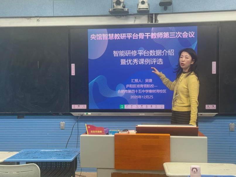 冬日暖阳融教研,智慧平台谱新篇。2025年12月25日下午,合肥市第四十五中学橡树湾校区开展央馆智慧教研平台骨干教师第三次会议,本次会议聚焦智能研修平台数据介绍与优秀课例评选工作,由庐阳区培育领航校代表吴捷主任主持汇报,全校骨干教师齐聚一堂,共探智慧教研新路径,共商优课评选新举措。