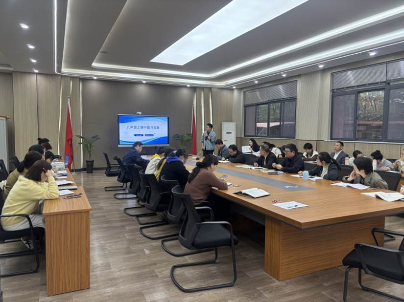 数学组召开期中复习经验分享会。七年级胡文武组长聚焦计算能力,通过每日小测与专项训练夯实基础;八年级胡涛老师强调“构建网络、狠抓基础”,系统梳理一次函数与三角形知识;九年级朱娟老师立足中考,规划阶段性复习,强化二次函数与相似形的综合应用。会议传递了“精准分层、错题复盘”的复习理念,为后续教学提供了清晰路径。