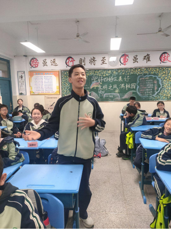 课堂结尾,王之易妈妈带来了有趣的小活动:“说说你的故乡在哪里”。话音刚落同学们就纷纷举手,热情高涨。有的同学说他的家乡也在淮南,骄傲地分享当地的牛肉汤;有的同学说自己的家乡在北京,“北京烤鸭外酥里嫩,肥而不腻,每次回去都要和家人一起吃”引得大家哈哈大笑。分享过程中大家认真倾听,不时为精彩的描述鼓掌,有的同学补充了家乡的小知识,还提醒其他同学忘介绍的文化或特色,互相帮助的样子格外温暖,充分展现了我们幸福17班的有爱与团结。