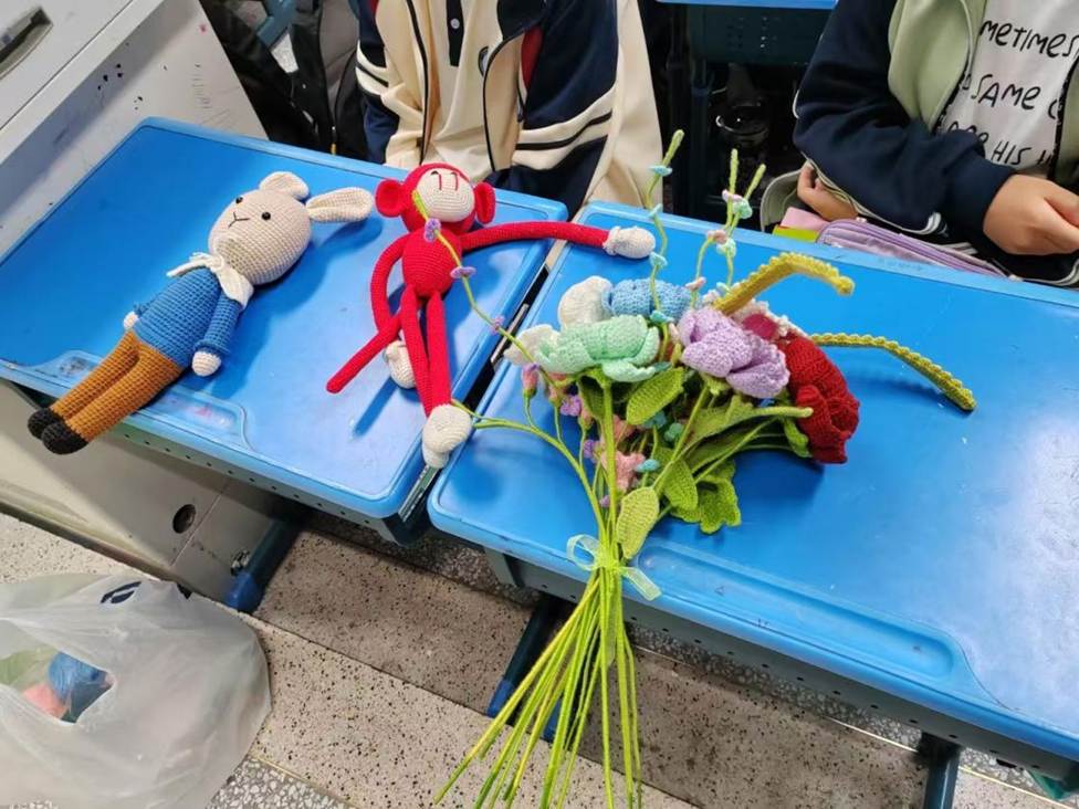 孩子们热情高涨,专注地盯着家长老师的动作,小手指捏着钩针和毛线,认真地模仿、尝试。课堂上充满了欢乐的分享声,原本安静的教室变成了热闹又温馨的手工小课堂。