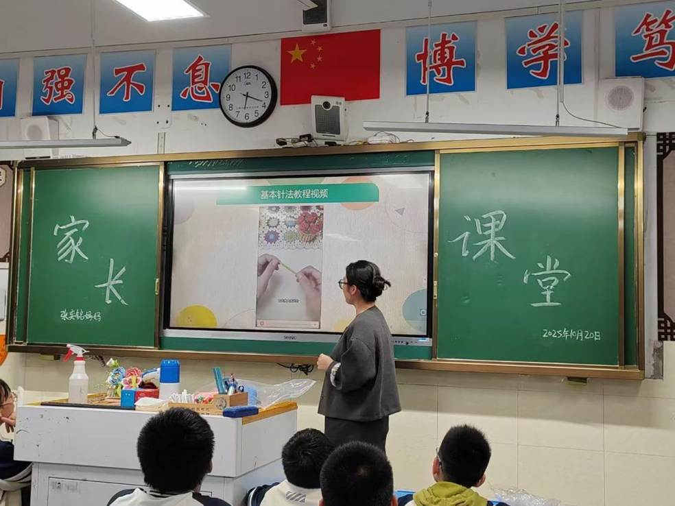 课堂上,家长化身“专业老师”,以亲切幽默的语言开启教学。她先是展示了自己精心制作的钩织作品——色彩鲜艳的小花、憨态可掬的小兔子、精致实用的杯垫,瞬间吸引了全班学生的目光,孩子们纷纷发出“好漂亮”“太神奇了”的赞叹,学习兴趣被充分点燃。