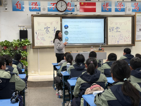 课堂伊始,家长带领同学们回望新中国波澜壮阔的发展历程。从中华人民共和国成立初期一穷二白的艰难起步,到独立完整的工业体系与国防体系逐步建立;从改革开放后的经济腾飞,到如今大国重器不断涌现、综合国力稳步提升。神舟五号载人航天、超级工程的震撼崛起等一个个真实鲜活的事例,让同学们深刻感受到祖国日新月异的变化,也读懂了一代代中国人艰苦奋斗、自强不息的精神密码,让同学们真切感受到家乡在国家科技创新版图中的分量。家长引导大家将个人理想融入国家发展,勉励同学们勤奋学习、勇于探索,立志攻克科技“卡脖子”关键技术,用青春智慧扛起强国重任。