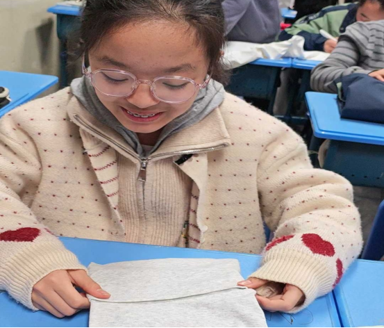 同学们认真聆听、积极动手,在实践中学习叠衣方法,有的同学专注练习,有的互相交流技巧,还有的同学展示自己的劳动成果,教室里充满了浓厚的学习氛围。大家在动手实践中掌握了收纳技能,更体会到劳动带来的成就感,养成了整洁有序的生活习惯。