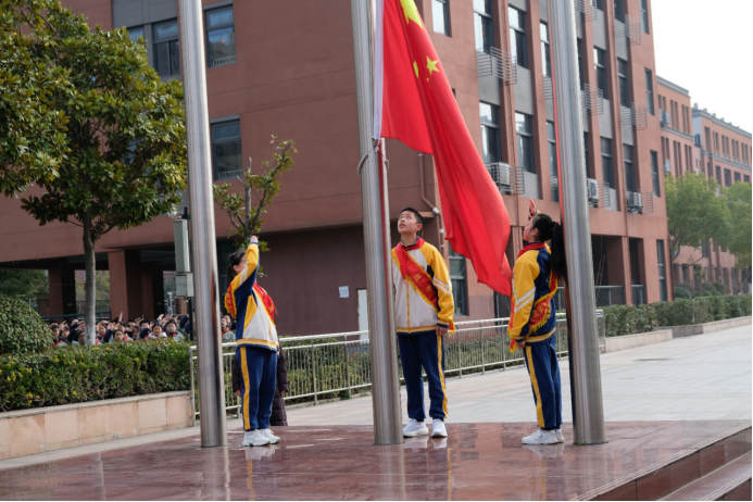 升旗仪式上,三人昂首挺立,护旗手捧旗入场,挂旗、甩旗,动作利落。升旗手拉动绳索,国旗缓缓上升。另外两人行注目礼,目光坚定。旗到杆顶,迎风飘扬,晨光中格外鲜艳。