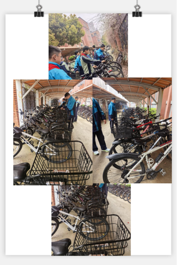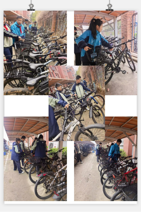 活动伊始,同学们带着饱满的热情迅速集结,明确分工、默契配合,迅速投入到自行车整理工作中。面对车库内杂乱停放、随意倾倒的自行车,大家毫无怨言、不怕脏不怕累,充分展现了新时代青少年的责任与担当。男生们主动扛起重担,弯腰搬运较重的车辆,将占道、倒伏的车辆一一扶起、挪至指定区域;女生们则细心细致,逐一调整车辆角度,确保每一辆车得车头车尾都摆放整齐、朝向一致,做到“横平竖直、井然有序”。