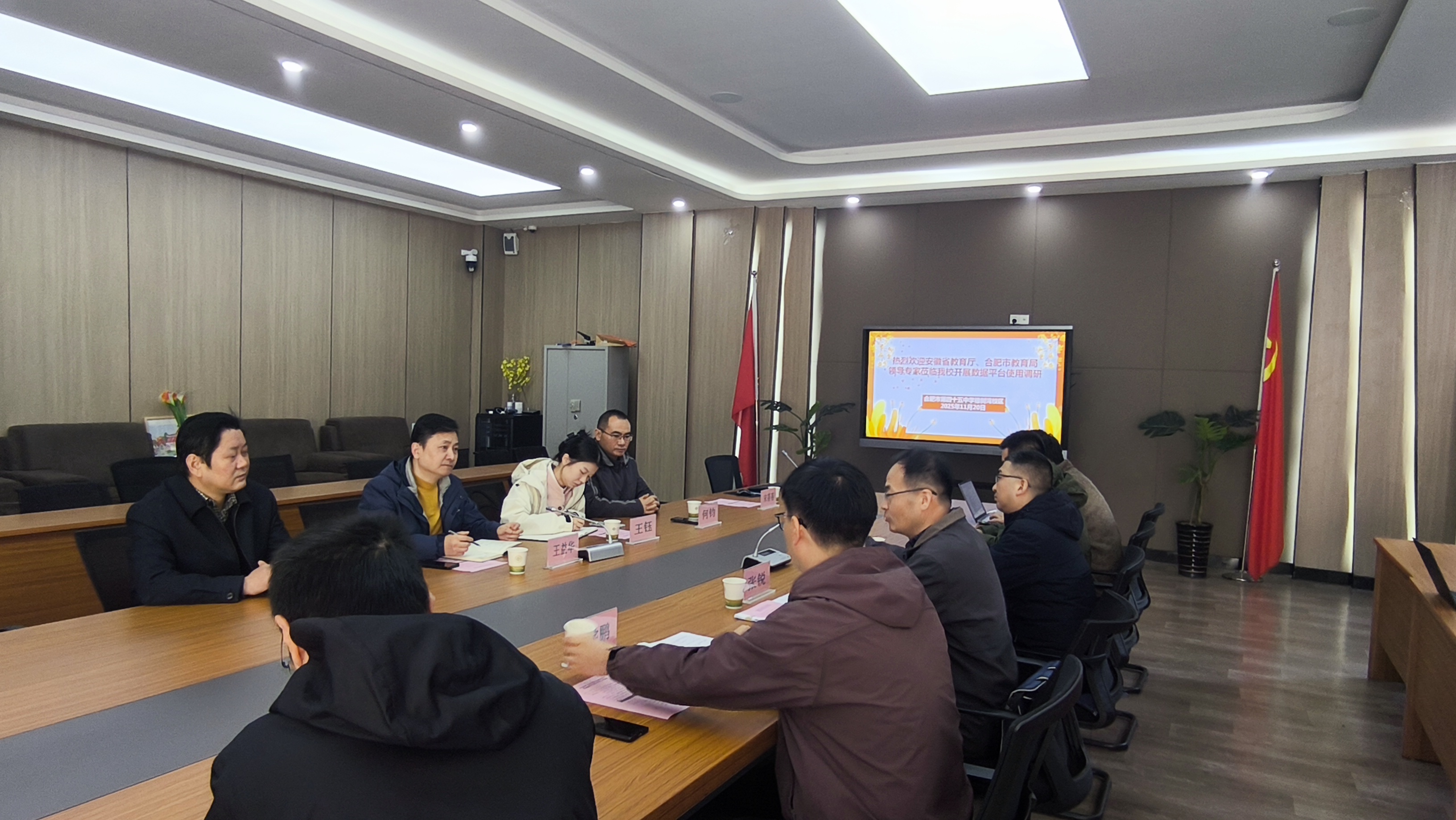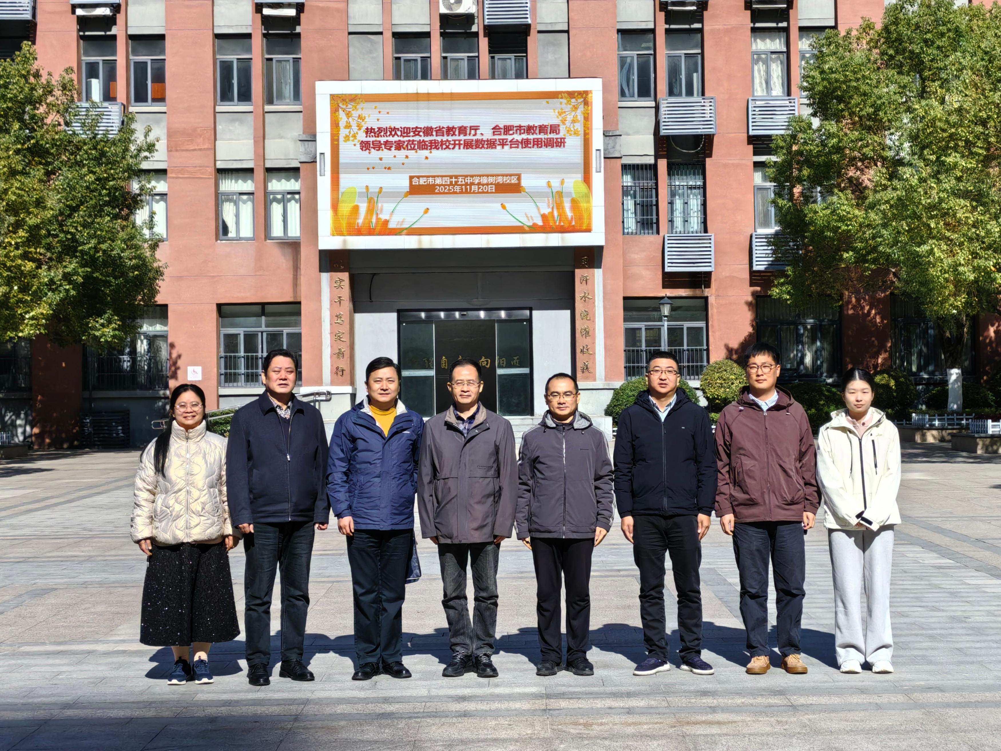 2025年11月20日上午,安徽省教育厅信息中心张锐、杨晓伟、余学鹏一行,在合肥市教育局王益华、王钰的陪同下,赴合肥市第四十五中学橡树湾校区,就数据平台试点应用工作开展专项调研。