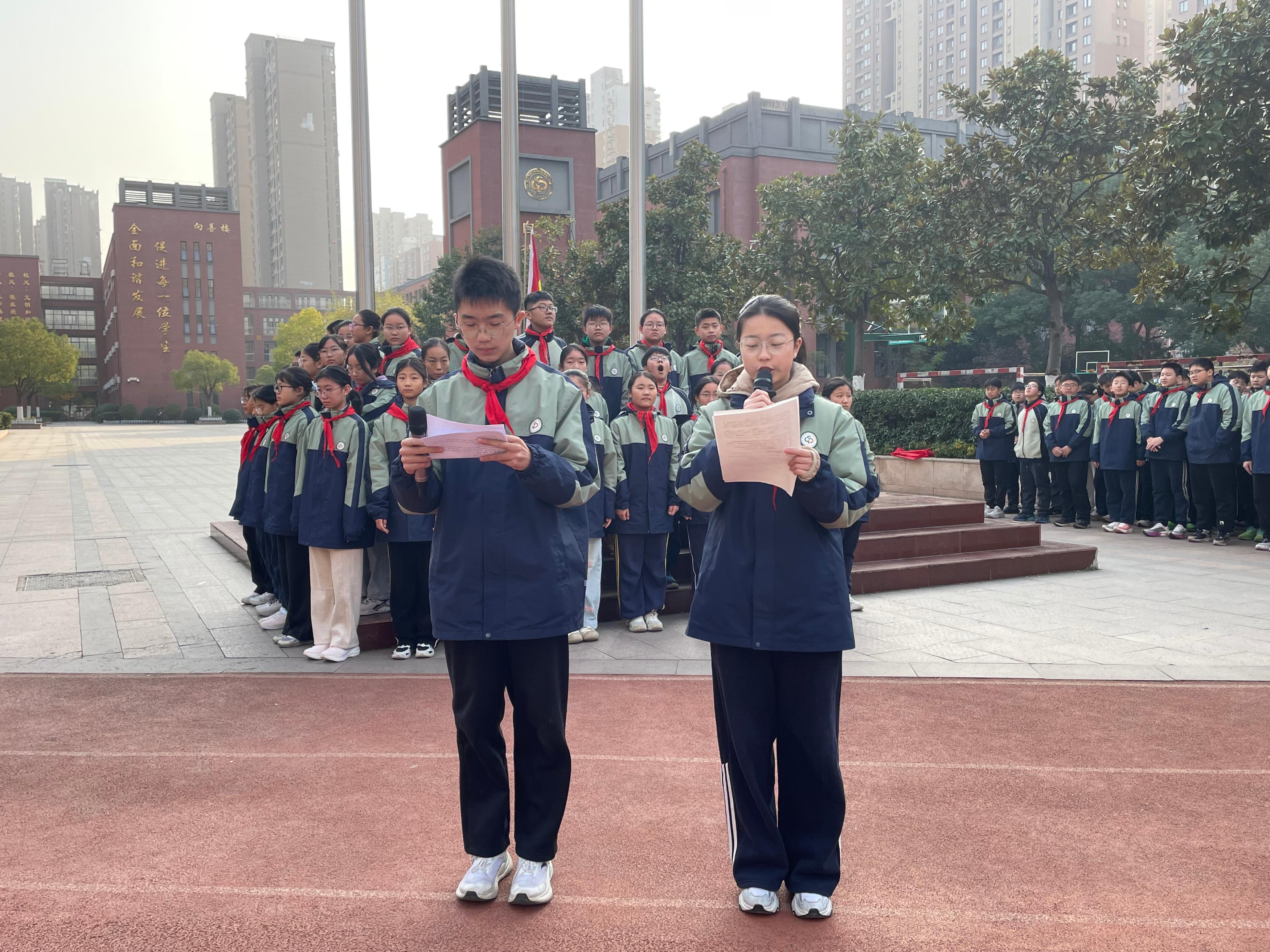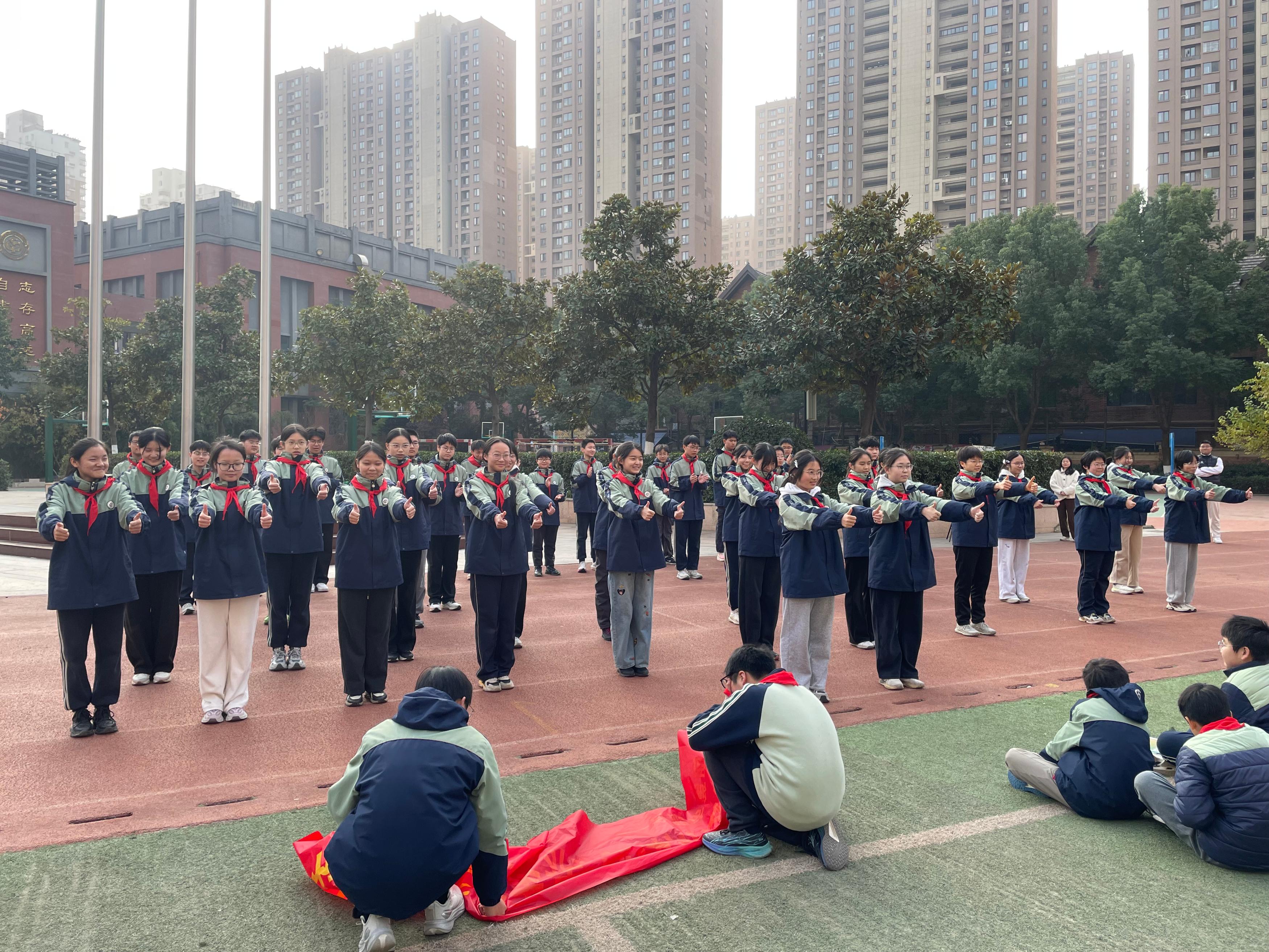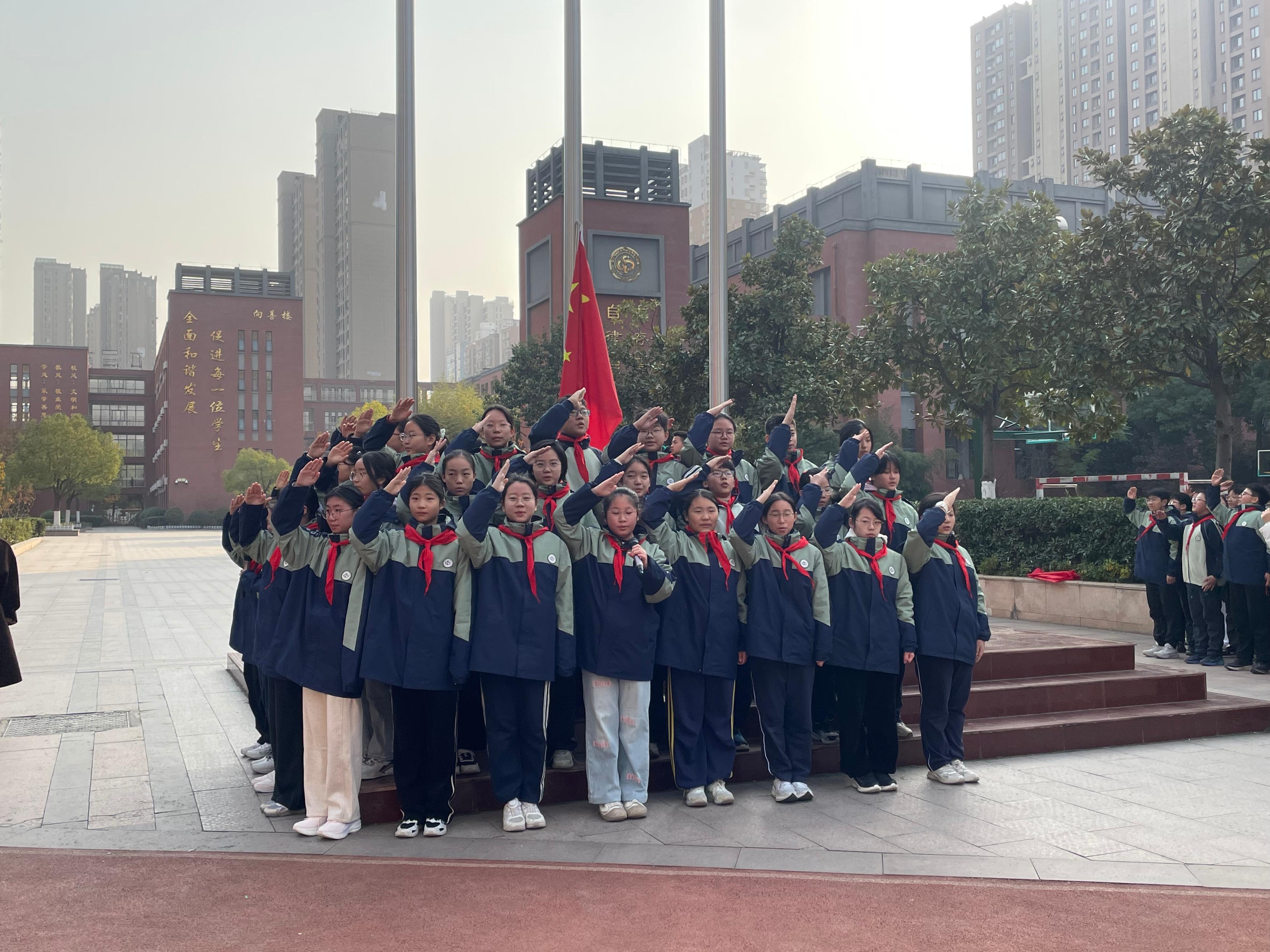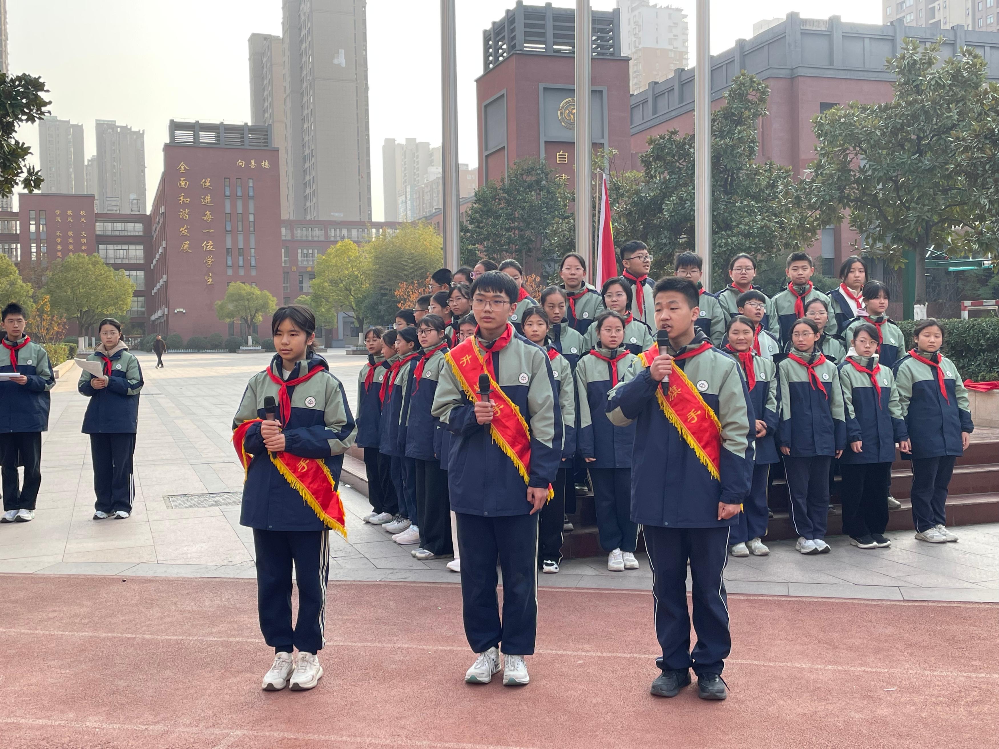 本次升旗仪式由八(6)班李恩泽、八(1)班郑晗灵同学主持。伴随着雄壮嘹亮的《义勇军进行曲》,八(10)班倪思娴、陈子墨、鲁振良三位升旗手身着整洁校服,精神饱满、步伐坚定地走向升旗台。他们目光庄重,动作规范,在全体师生的注目礼中,将鲜艳的五星红旗徐徐升起。朝阳之下,国旗迎风飘扬,少先队员行队礼,其余师生行注目礼,嘹亮的国歌声响彻校园,既表达了对祖国的热爱,也寄托了对法治中国的美好期盼。