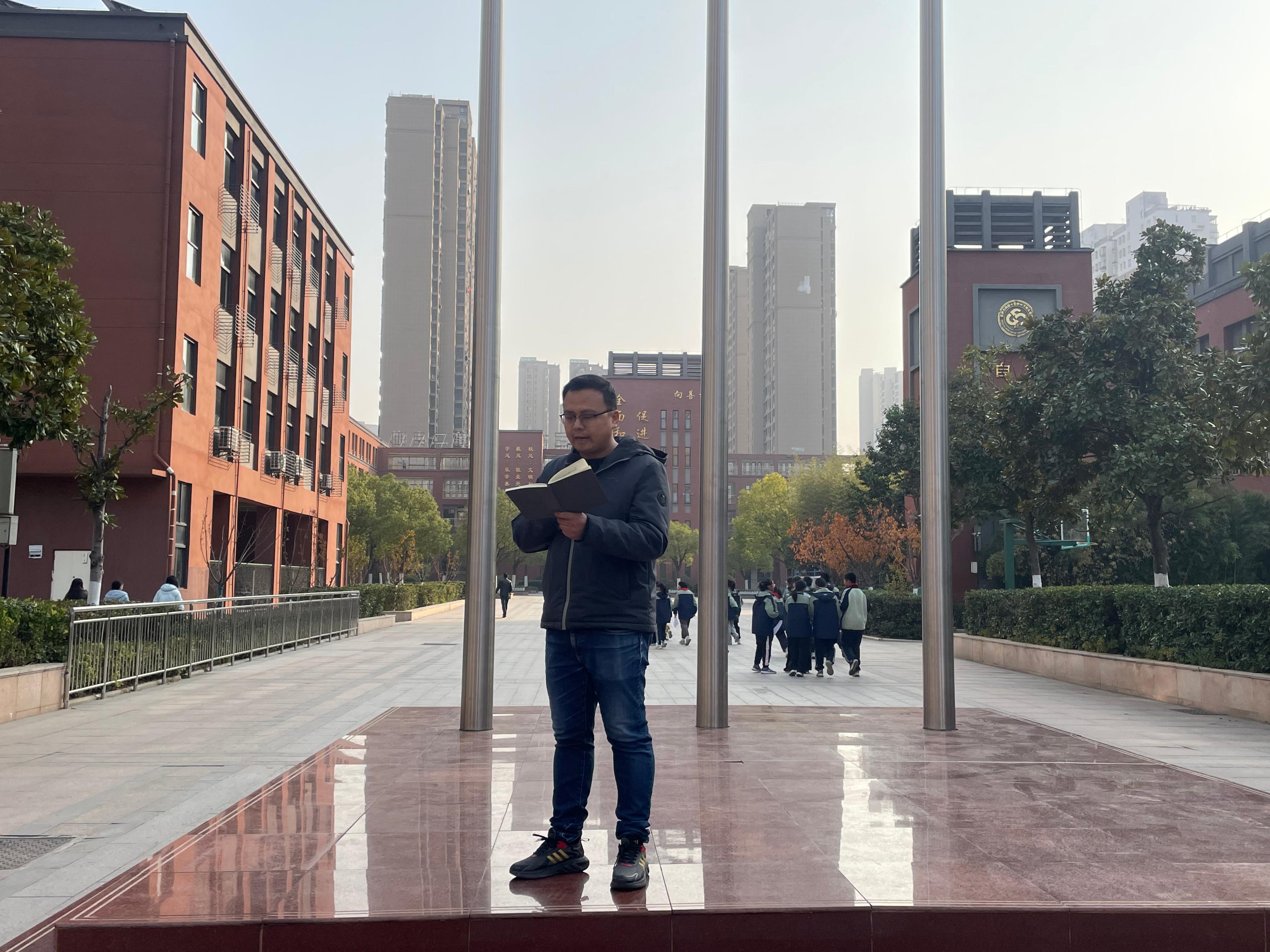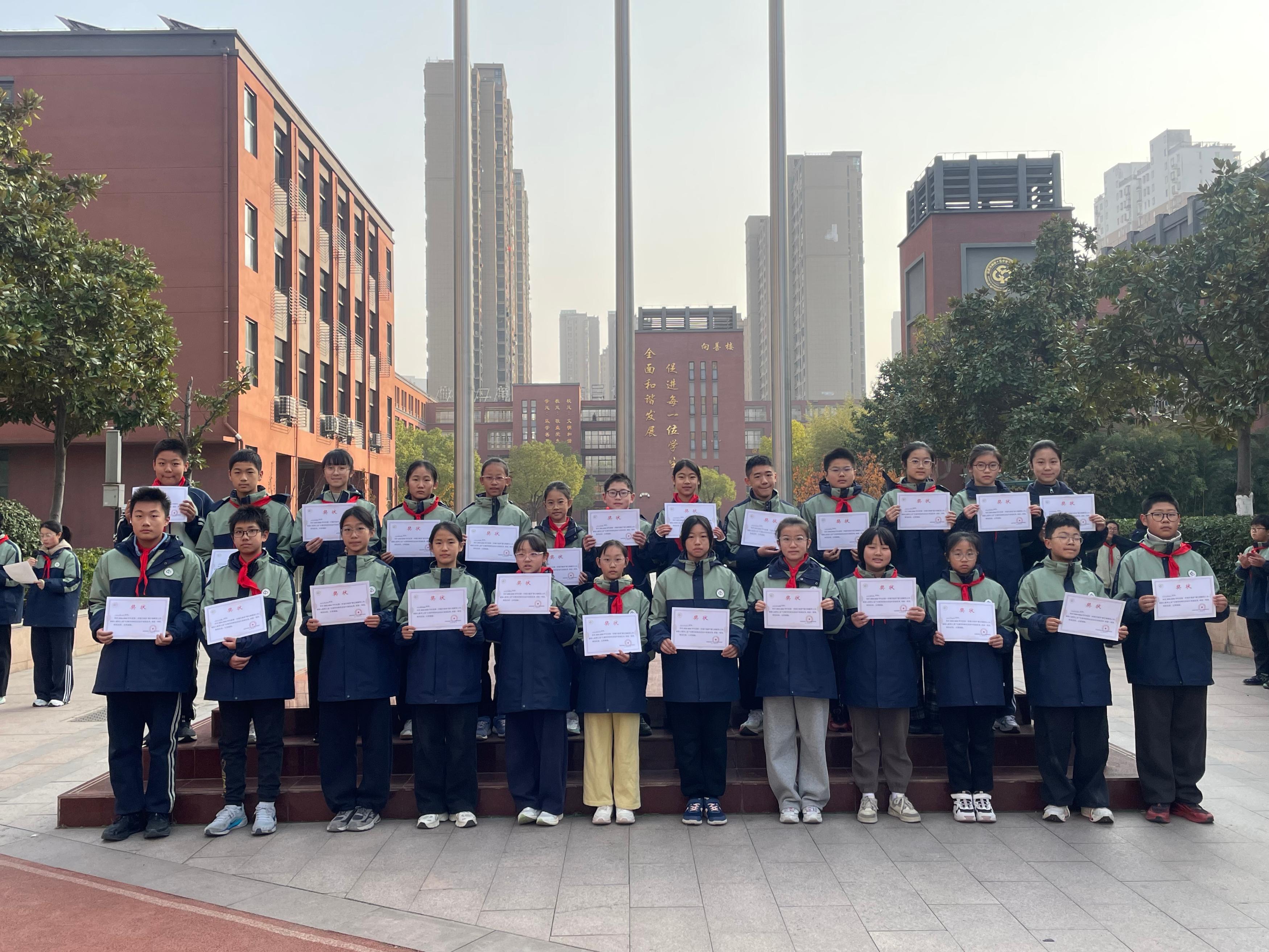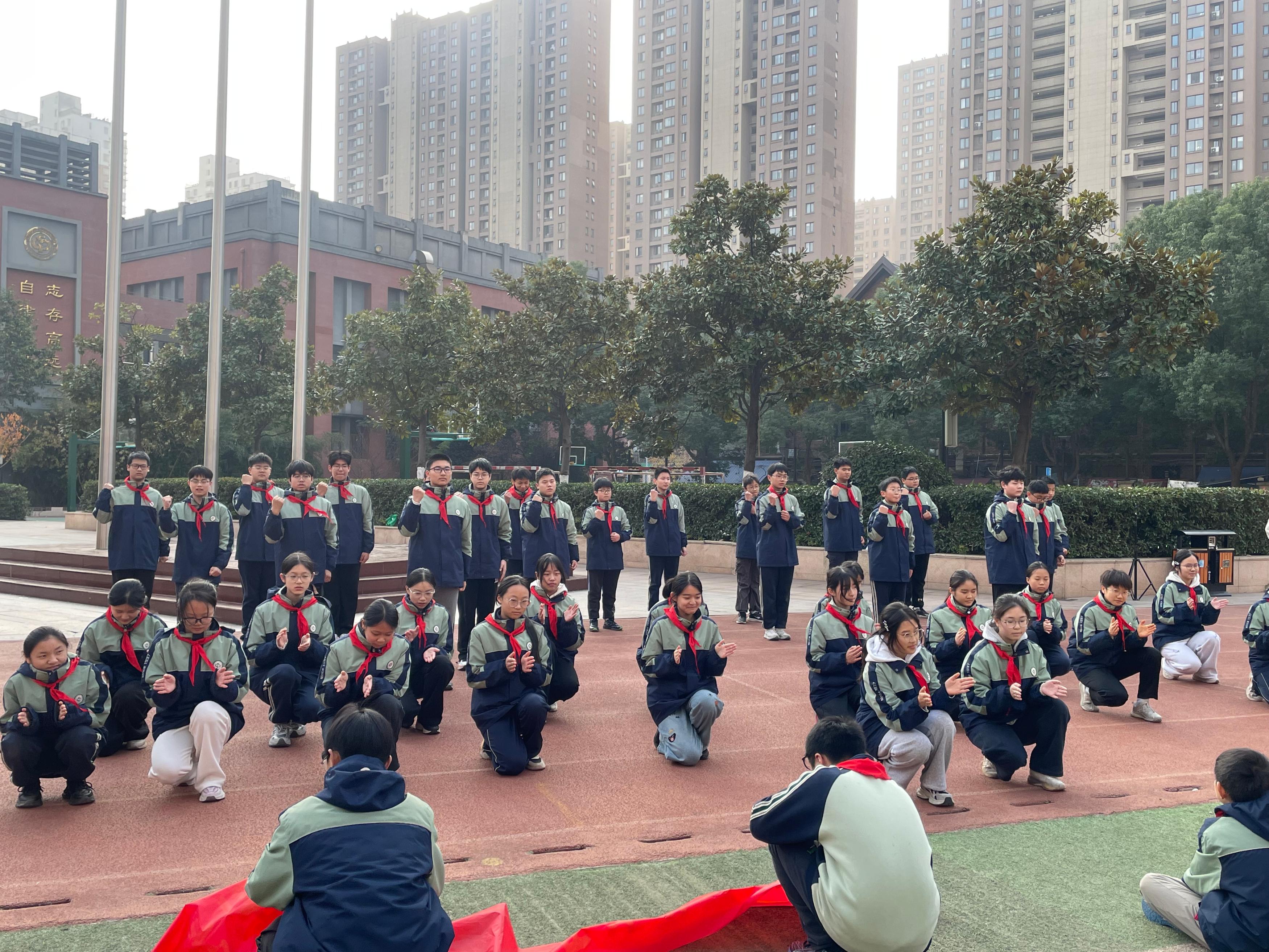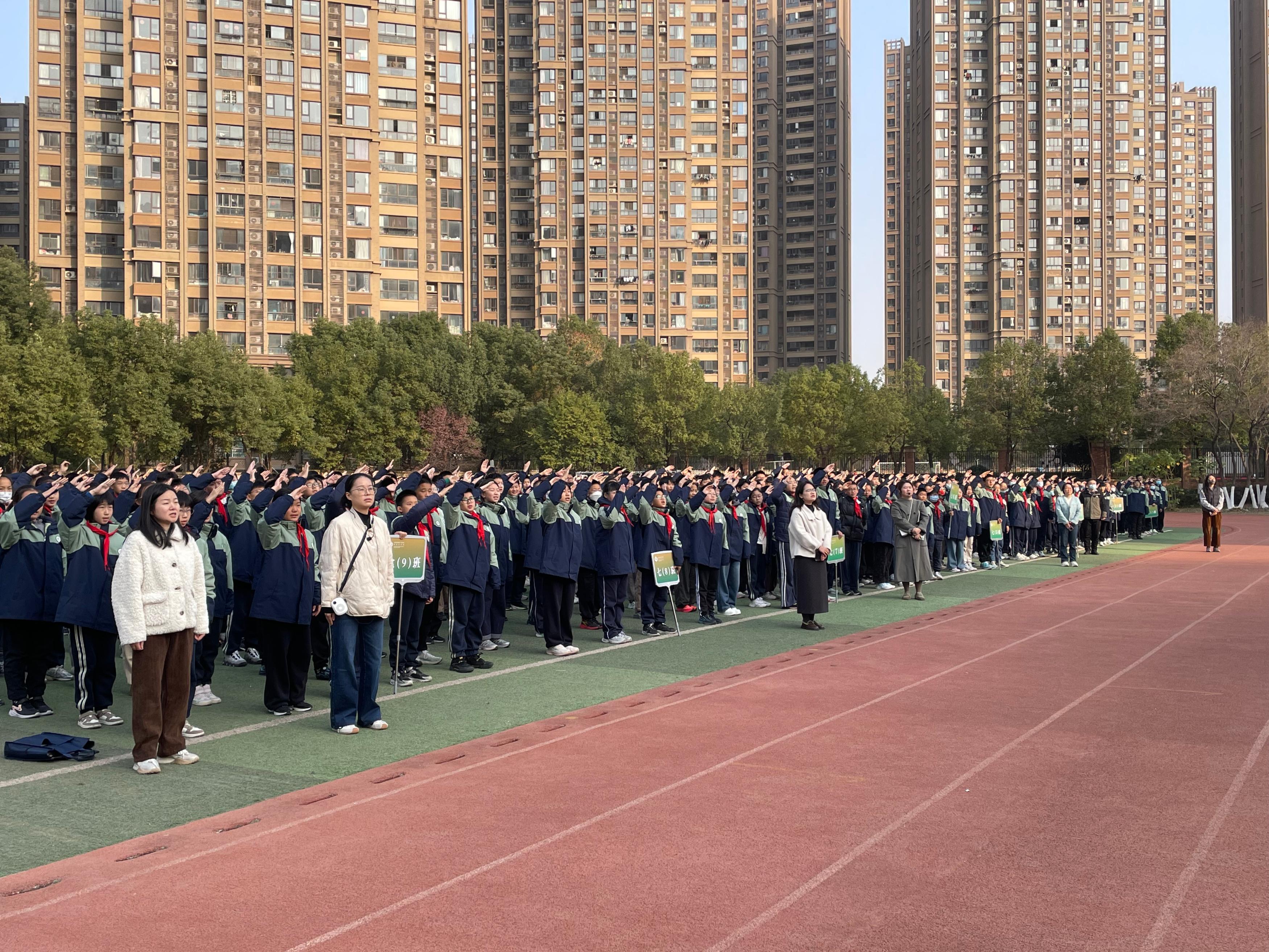 本次升旗仪式由八(6)班李恩泽、八(1)班郑晗灵同学主持。伴随着雄壮嘹亮的《义勇军进行曲》,八(10)班倪思娴、陈子墨、鲁振良三位升旗手身着整洁校服,精神饱满、步伐坚定地走向升旗台。他们目光庄重,动作规范,在全体师生的注目礼中,将鲜艳的五星红旗徐徐升起。朝阳之下,国旗迎风飘扬,少先队员行队礼,其余师生行注目礼,嘹亮的国歌声响彻校园,既表达了对祖国的热爱,也寄托了对法治中国的美好期盼。