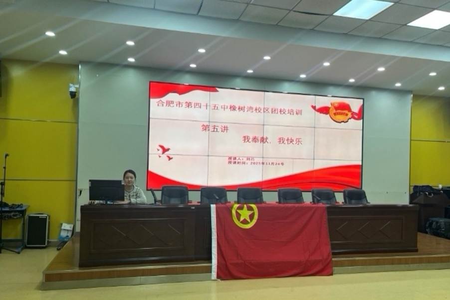 20251124日下午,合肥市第四十五中学橡树湾校区在报告厅开展团校课程第五课——《我奉献、我快乐》,由九年级团员老师刘巧授课,九年级各班入团积极分子参与。