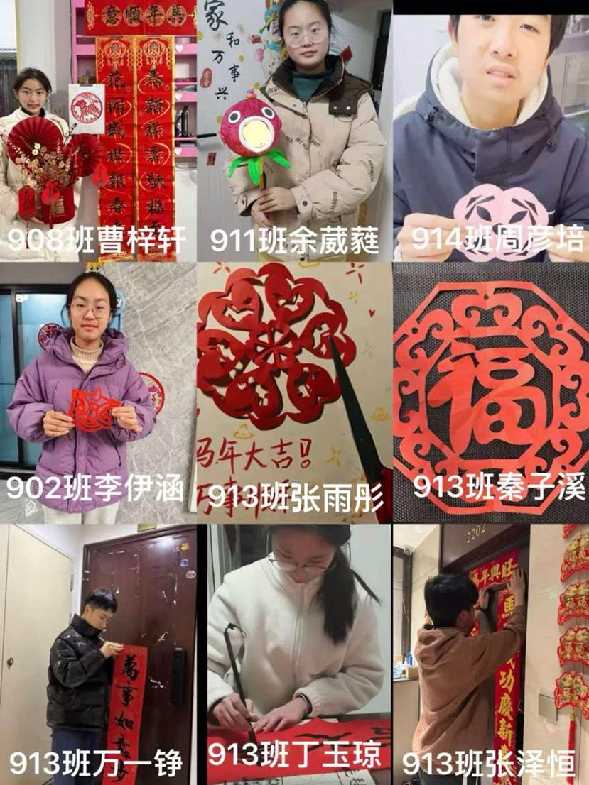 一纸春联寄新春,一剪窗花迎福年。贴春联、剪窗花是春节最具仪式感的传统习俗,也是同学们感受年味的重要方式。同学们和家人一起挑选红纸,认真研墨、仔细书写春联,或一同构图、巧手裁剪窗花。一笔一划间,书写的是对新年的美好期许;一折一剪间,绽放的是指尖传承的民俗芳华。同学们在动手实践中读懂了春节辞旧迎新、祈福纳祥的文化内涵,也在与家人的协作中体会到传统年俗的独特魅力。