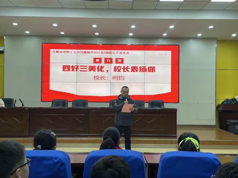 接着德育处李昆主任对上一周校园常规工作进行了总结,希望同学们能够践行“四好三美化”的要求,爱护校园环境,规范自身言行。 仪式最后一项是“四好三美化,校长表扬你”环节,何钧校长对上周拾金不昧、乐于助人、文明言行的同学予以表彰,希望同学们以他们为榜样,从点滴小事做起,主动关心他人、热心奉献,让互助之风吹遍校园每一个角落,共同营造温暖、和谐、友爱的校园氛围。
