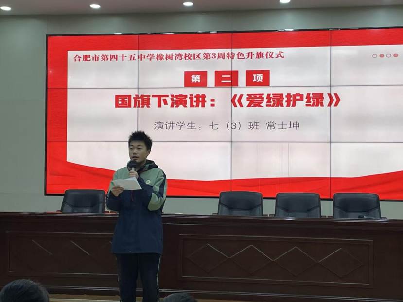 紧接着,七(3)班常士坤同学在国旗下做《爱绿护绿》演讲,向师生们普及植物保护知识,传递绿色发展理念,倡导人人争做护绿使者,自觉爱护一草一木,珍惜校园生态环境。