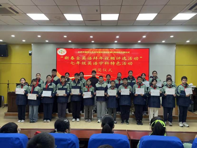 在国旗下颁奖环节,校领导为在七年级英语学科特色活动中获奖的同学颁奖,鼓励他们继续努力,展现个人风采。