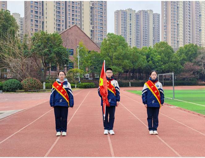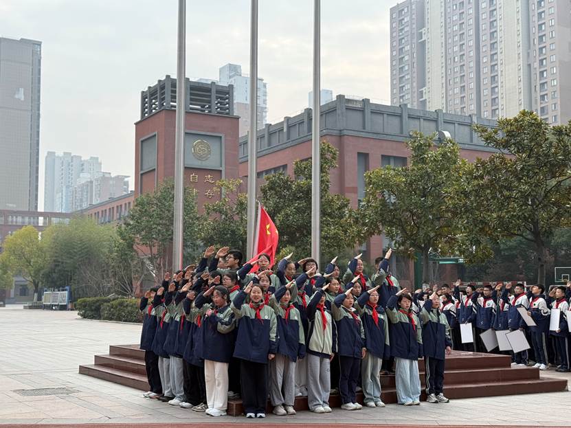 清晨的校园,七(4)班的三名同学:刘翌铭、博尔、黄馨晨担任本次升旗手,他们步伐铿锵、精神饱满,在全体师生的注目下护送国旗走向升旗台。伴随着雄壮嘹亮的《义勇军进行曲》,鲜艳的五星红旗冉冉升起、迎风舒展。全体师生肃立注目,齐声高唱国歌,嘹亮的歌声在校园上空久久回荡。