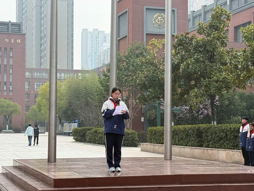 升旗仪式后,七(4)班戴诗宸上台,以“守护舌尖安全,争做健康少年”为题进行国旗下发言。她结合中学生的生活,向全体同学发出倡议:自觉远离“三无”食品、过期变质食品,不购买校园周边流动摊贩的不洁零食;养成饭前洗手、合理搭配三餐、不挑食的好习惯;主动学习食品安全辨别知识,增强自我保护意识;节约粮食,以文明就餐、健康饮食的实际行动见证青春成长。她的发言真挚恳切、贴近生活,引发全体同学强烈共鸣。